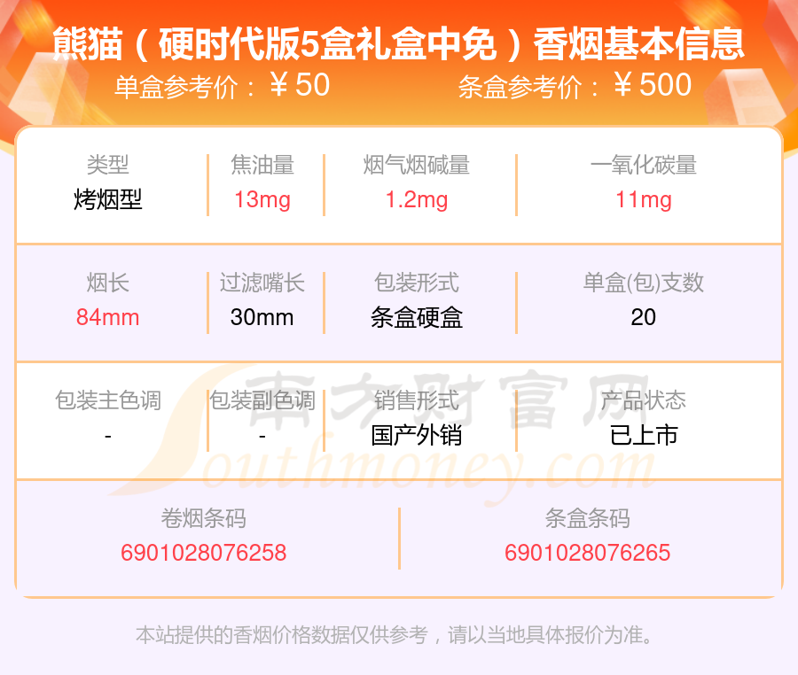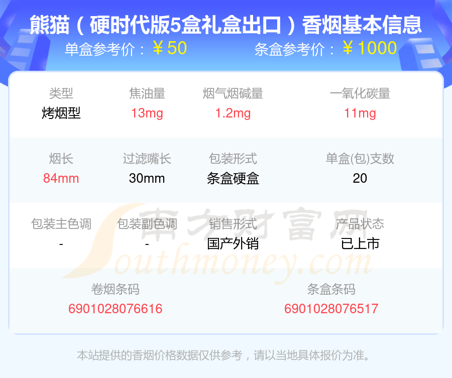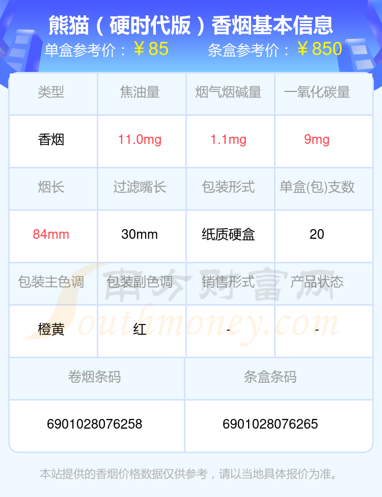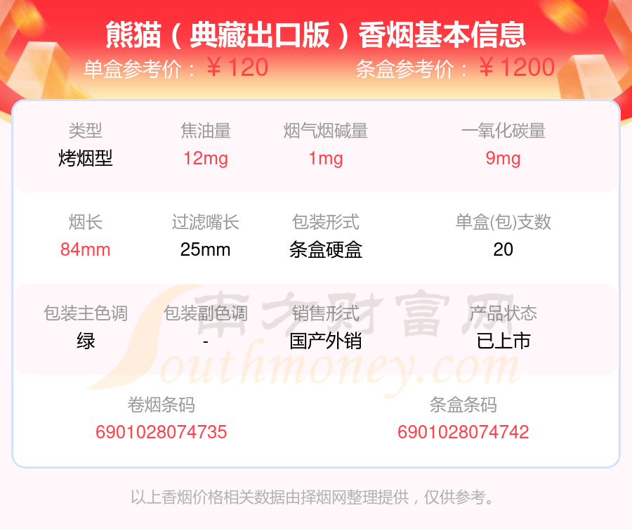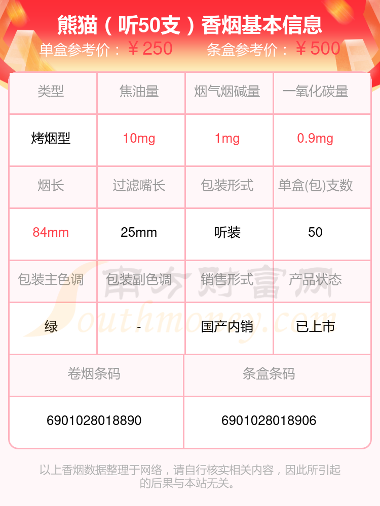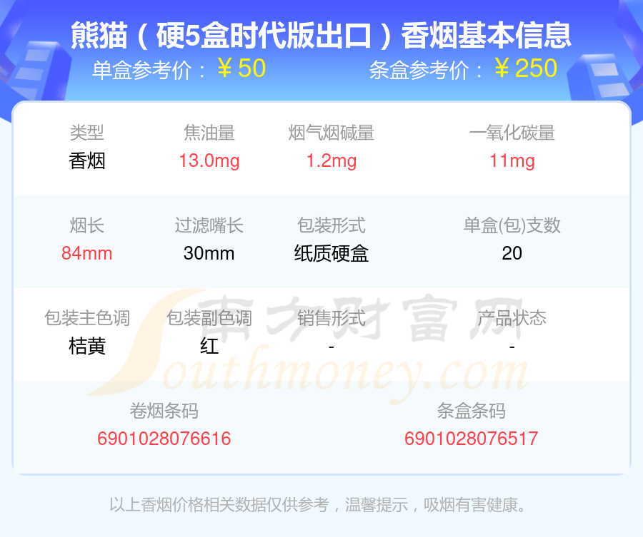 择烟网为大家盘点了熊猫香烟尼古丁1~2mg左右的,分别有熊猫(典藏版)、熊猫(硬5盒时代版出口)、熊猫(硬时代版5盒礼盒出口)、熊猫(硬时代版5盒礼盒中免)、熊猫(硬时代)、熊猫(硬时代版)、熊猫(硬经典)、熊猫(听50支)、熊猫(典藏出口版)等,具体价格如下: