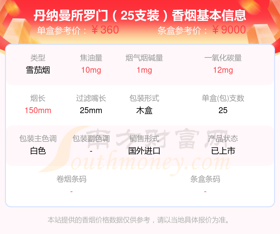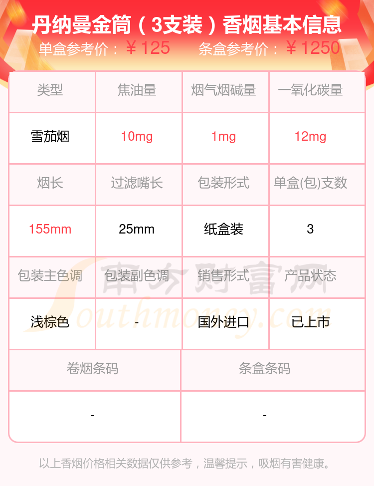 丹纳曼所罗门(25支装)参考价360元/包、丹纳曼金筒(3支装)参考价125元/包等。