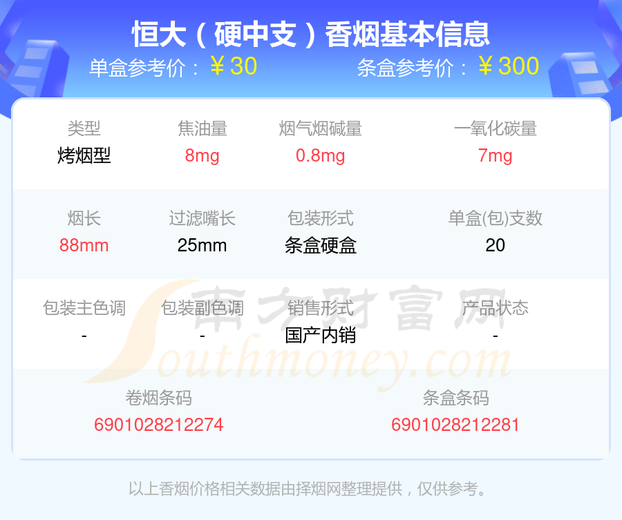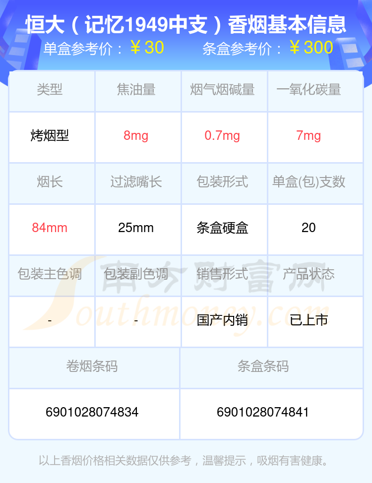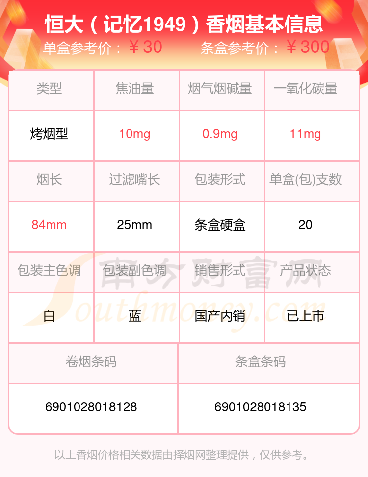 恒大香烟10~40元的烟分别有恒大(记忆1949中支)参考价30元/包、恒大(硬中支)参考价30元/包、恒大(记忆1949)参考价30元/包等。