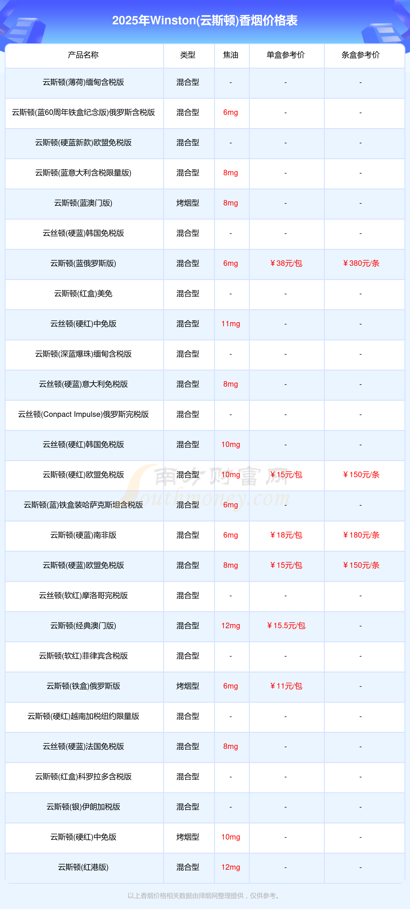 Winston(云斯顿)香烟最新价格2025:云斯顿(蓝俄罗斯版)参考价38.0元/包、云斯顿(硬蓝)南非版参考价18.0元/包、云斯顿(经典澳门版)参考价15.5元/包、云斯顿(硬红)欧盟免税版参考价15.0元/包、云斯顿(硬蓝)欧盟免税版参考价15.0元/包、云斯顿(铁盒)俄罗斯版参考价11.0元/包。