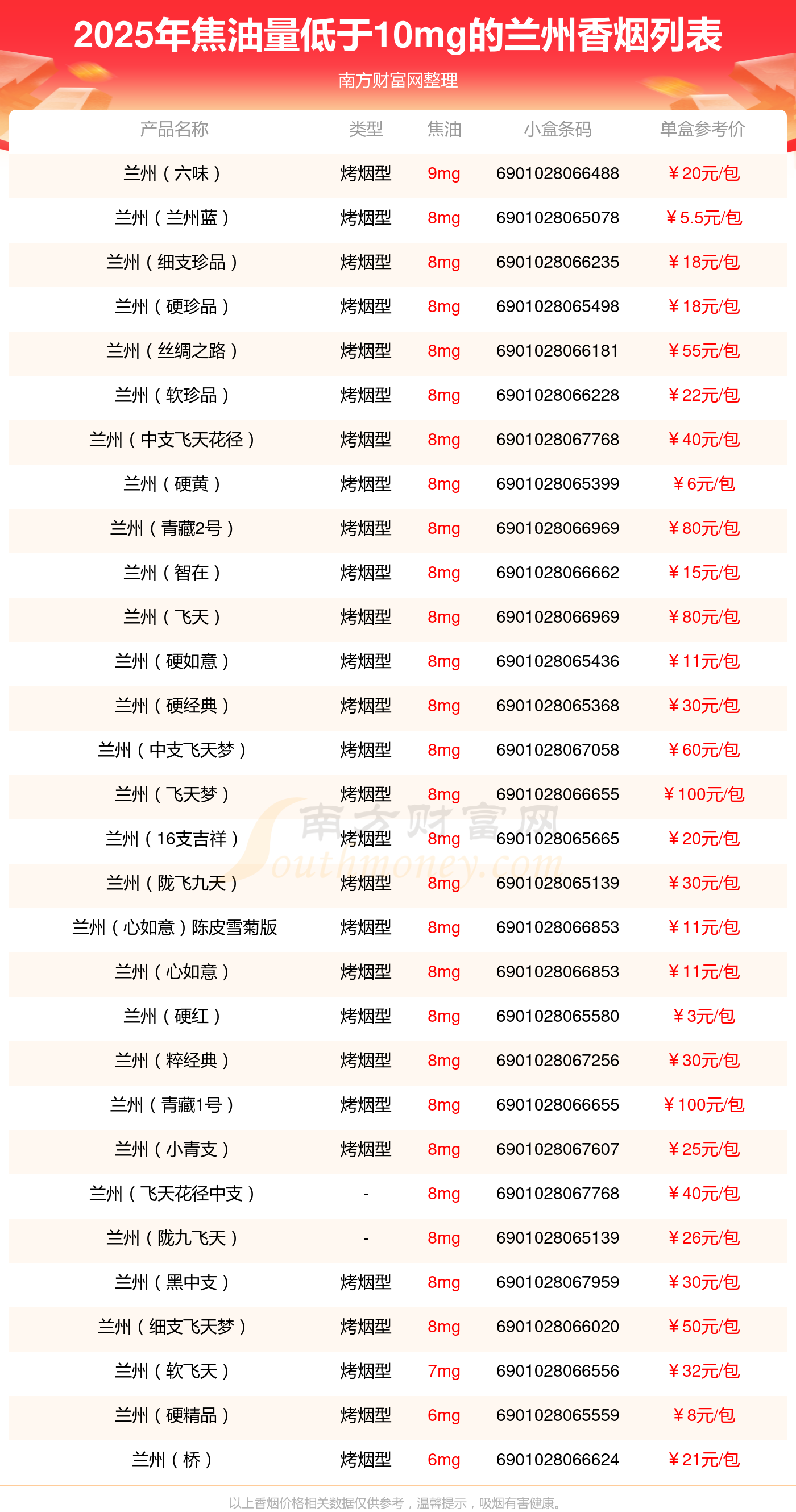 兰州(六味)参考价20.0元/包、兰州(兰州蓝)参考价5.5元/包、兰州(细支珍品)参考价18.0元/包、兰州(硬珍品)参考价18.0元/包、兰州(丝绸之路)参考价55.0元/包、兰州(软珍品)参考价22.0元/包、兰州(中支飞天花径)参考价40.0元/包、兰州(硬黄)参考价6.0元/包、兰州(青藏2号)参考价80.0元/包、兰州(智在)参考价15.0元/包等。