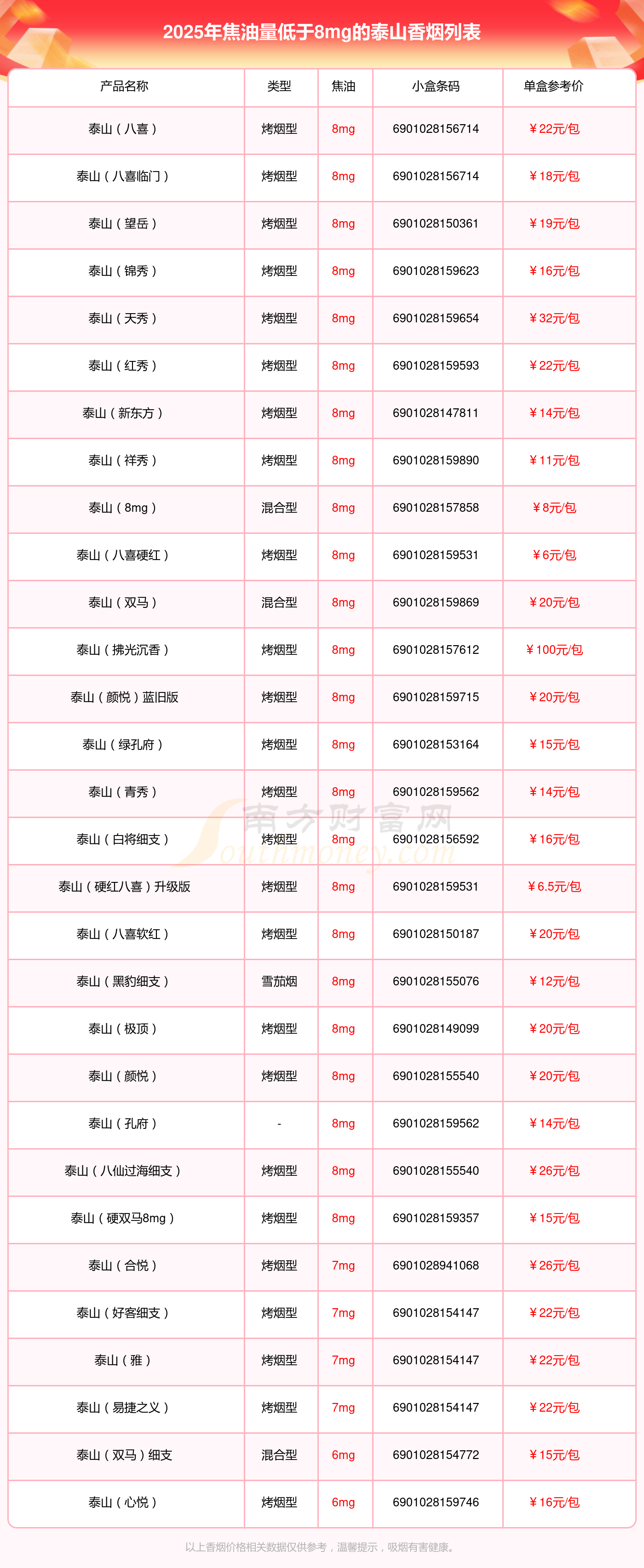 泰山香烟焦油量低于8mg的烟有泰山(八喜)、泰山(八喜临门)、泰山(望岳)、泰山(锦秀)、泰山(天秀)、泰山(红秀)、泰山(新东方)、泰山(祥秀)、泰山(8mg)、泰山(八喜硬红)等,详细价格如下: