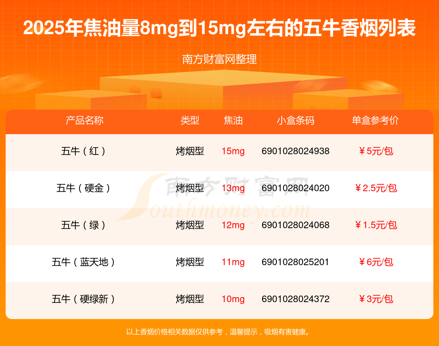 择烟网为大家盘点了五牛香烟焦油量8mg到15mg左右的,分别有五牛(红)、五牛(硬金)、五牛(绿)、五牛(蓝天地)、五牛(硬绿新)等,具体价格如下: