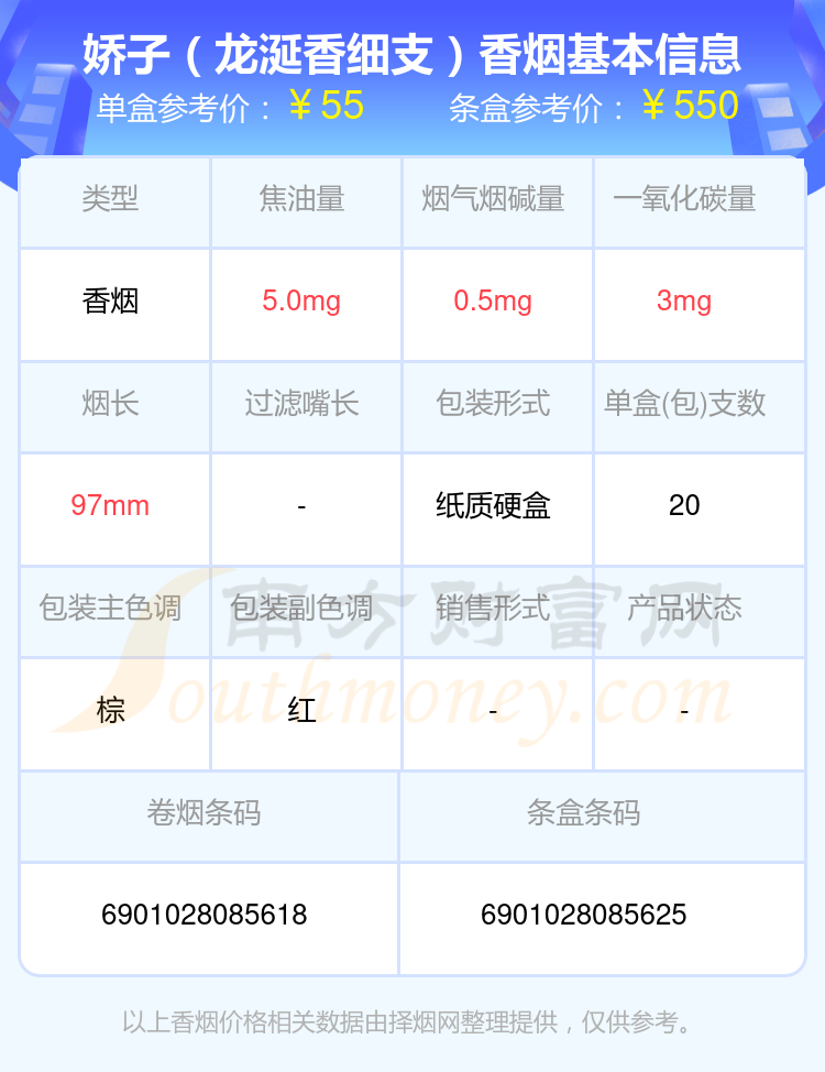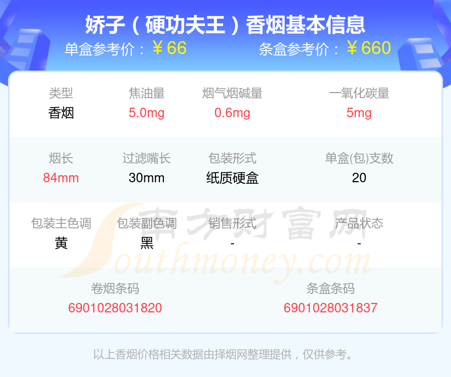 娇子香烟焦油量5mg以下的烟分别有娇子(龙涎香细支)参考价55.0元/包、娇子(X2)参考价15.0元/包、娇子(硬功夫王)参考价66.0元/包等。