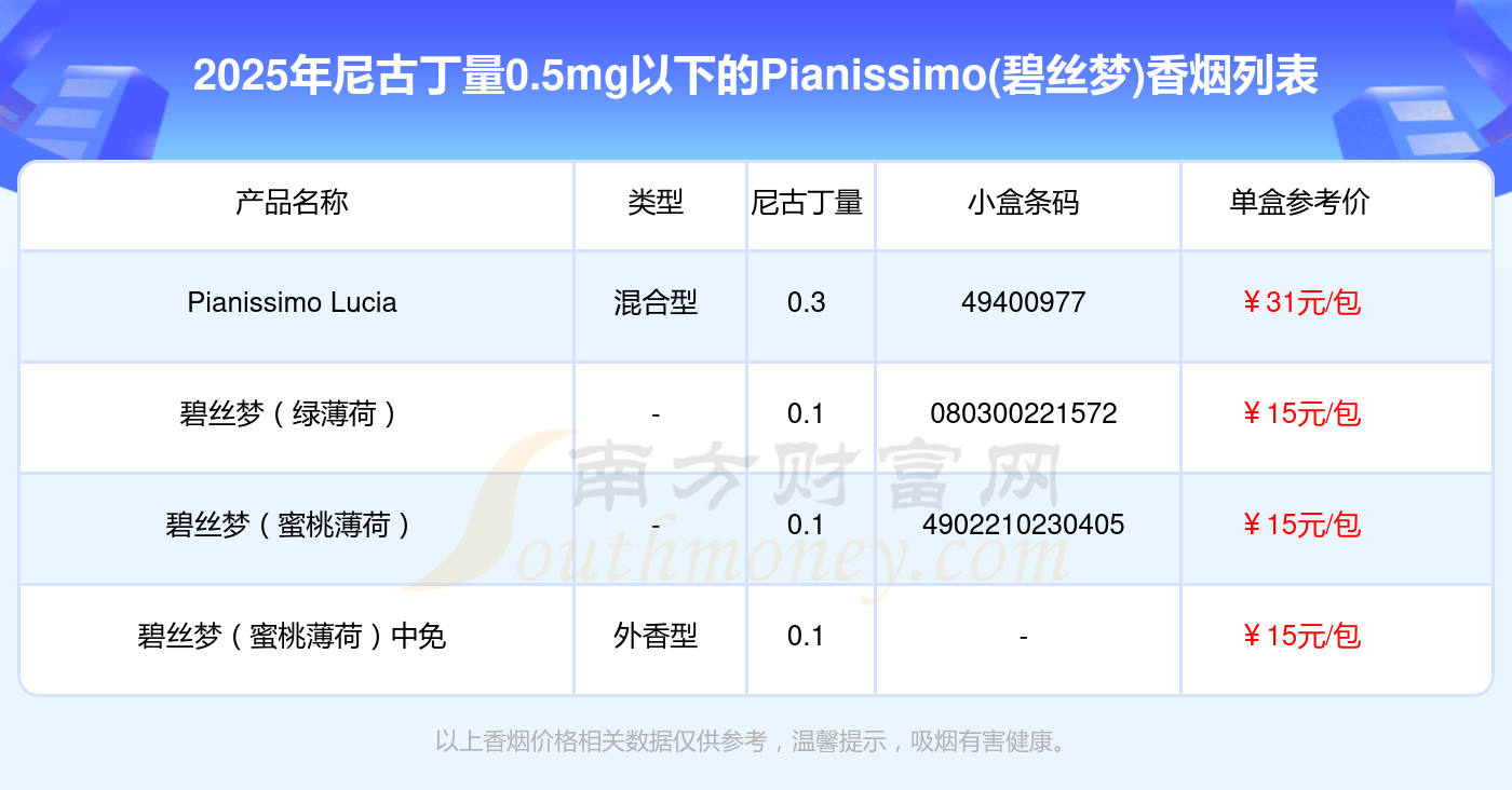 Pianissimo(碧丝梦)香烟尼古丁量0.5mg以下的烟有Pianissimo Lucia、碧丝梦(绿薄荷)、碧丝梦(蜜桃薄荷)、碧丝梦(蜜桃薄荷)中免等,详细价格如下:
