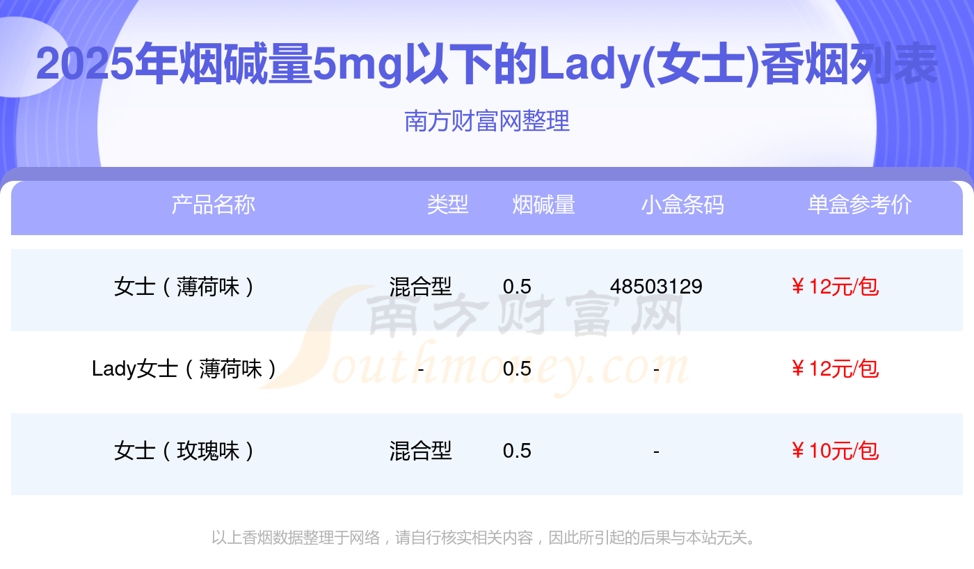 Lady(女士)香烟烟碱量5mg以下的烟分别有女士(薄荷味)参考价12元/包、Lady女士(薄荷味)参考价12元/包、女士(玫瑰味)参考价10元/包等。