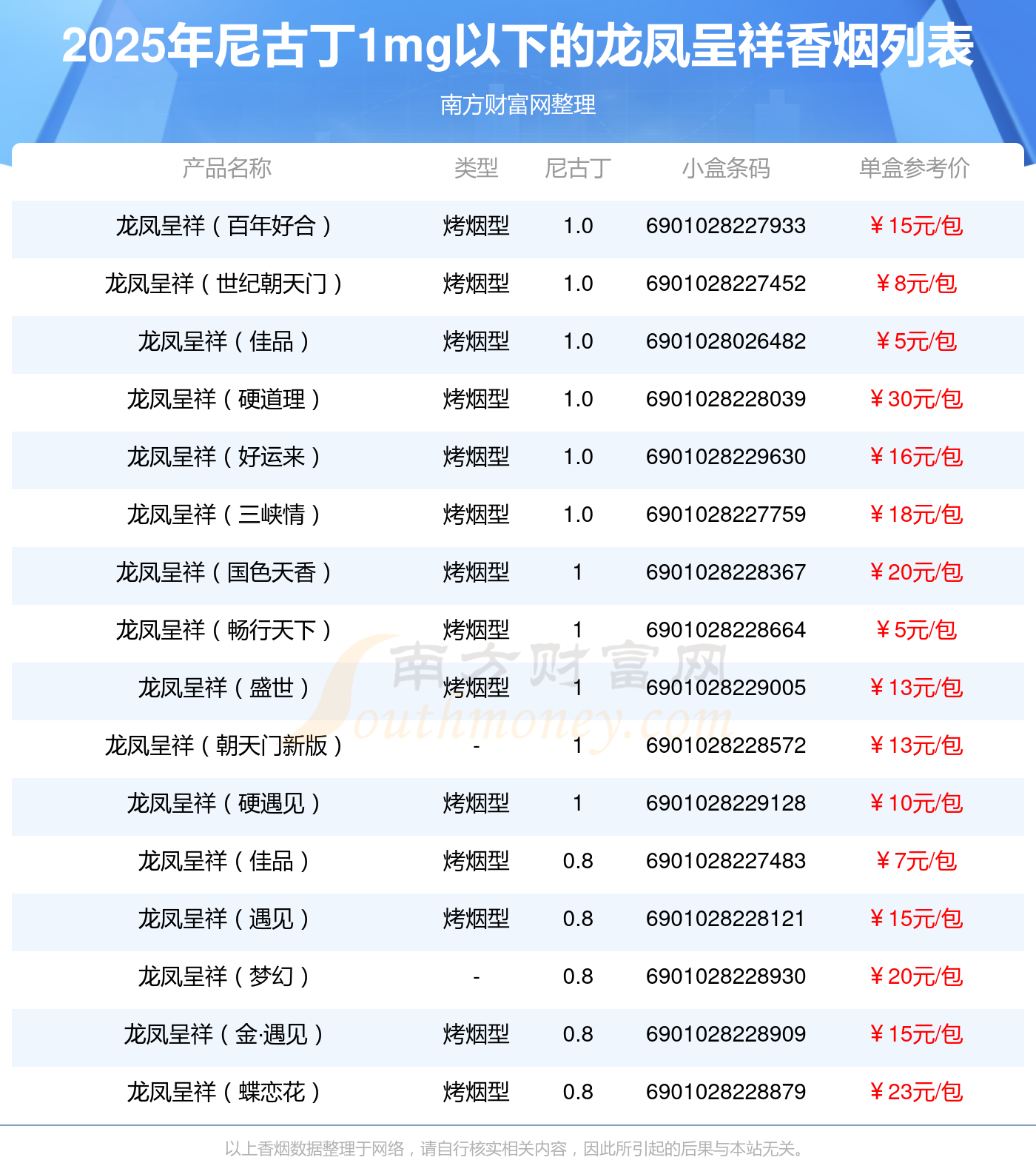 择烟网为大家盘点了龙凤呈祥香烟尼古丁1mg以下的烟,有以下这些: