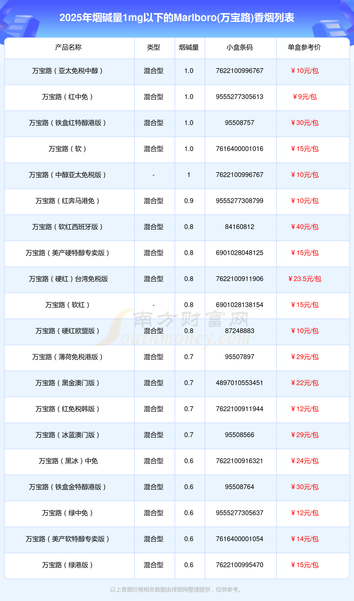 择烟网为大家盘点了烟碱量1mg以下的Marlboro(万宝路)香烟,有万宝路(亚太免税中醇)、万宝路(红中免)、万宝路(铁盒红特醇港版)、万宝路(软)、万宝路(中醇亚太免税版)、万宝路(红奔马港免)、万宝路(软红西班牙版)、万宝路(美产硬特醇专卖版)、万宝路(硬红)台湾免税版、万宝路(软红)等,详细价格如下: