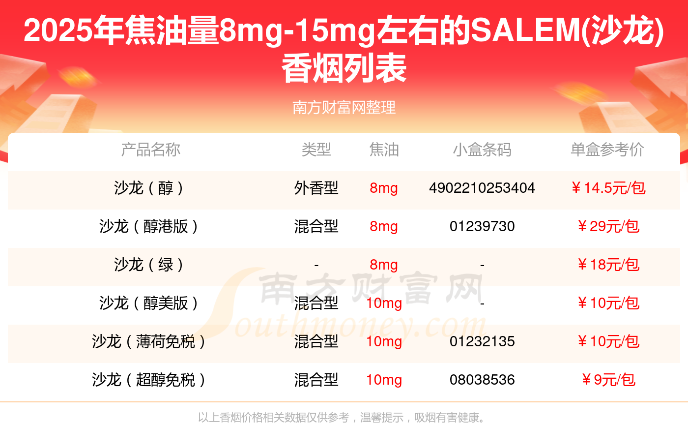 SALEM(沙龙)香烟焦油量8mg-15mg左右的烟分别有沙龙(醇)参考价14.5元/包、沙龙(醇港版)参考价29元/包、沙龙(绿)参考价18元/包、沙龙(醇美版)参考价10元/包、沙龙(薄荷免税)参考价10元/包、沙龙(超醇免税)参考价9元/包等。