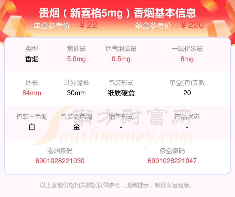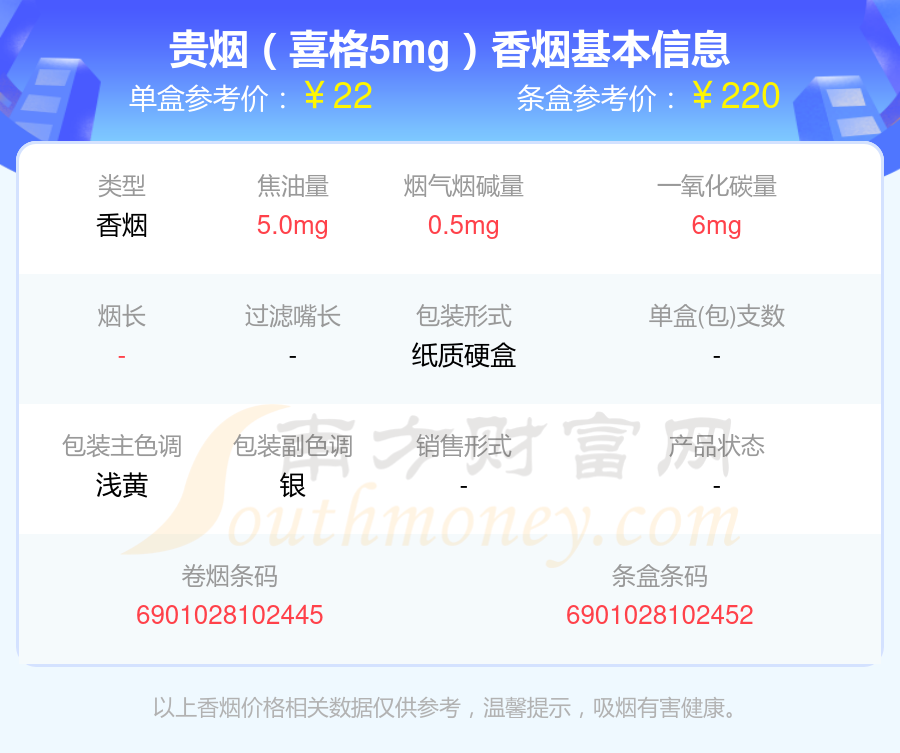 择烟网为大家盘点了烟碱量低于0.5mg的贵烟香烟,有贵烟(喜格5mg)、贵烟(新喜格5mg)等,详细价格如下: