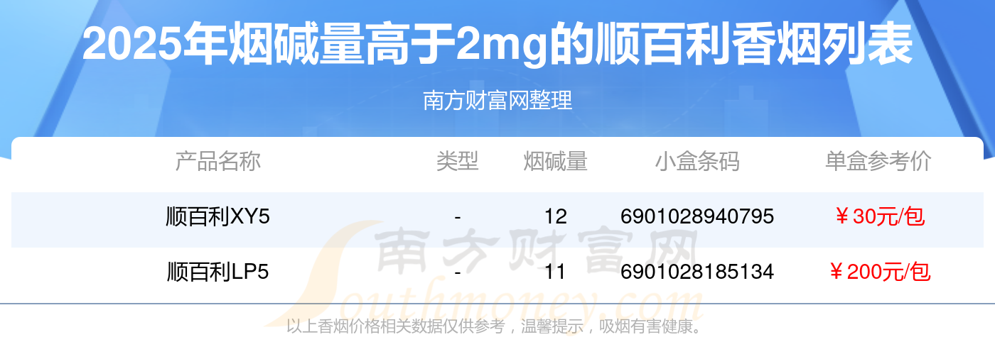 择烟网为大家盘点了顺百利香烟烟碱量高于2mg的,分别有顺百利XY5、顺百利LP5等,具体价格如下: