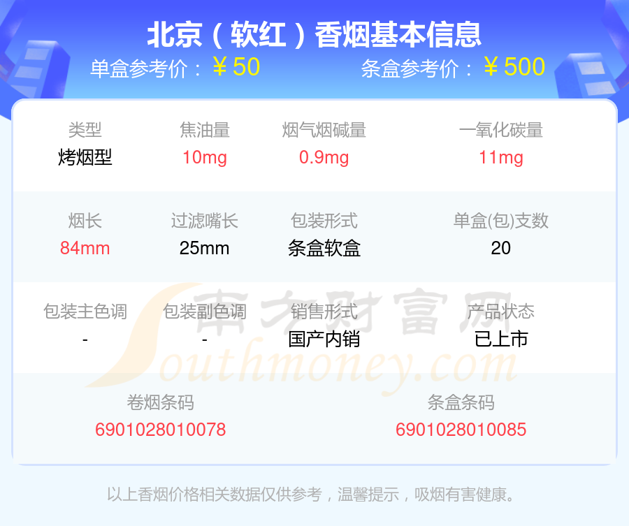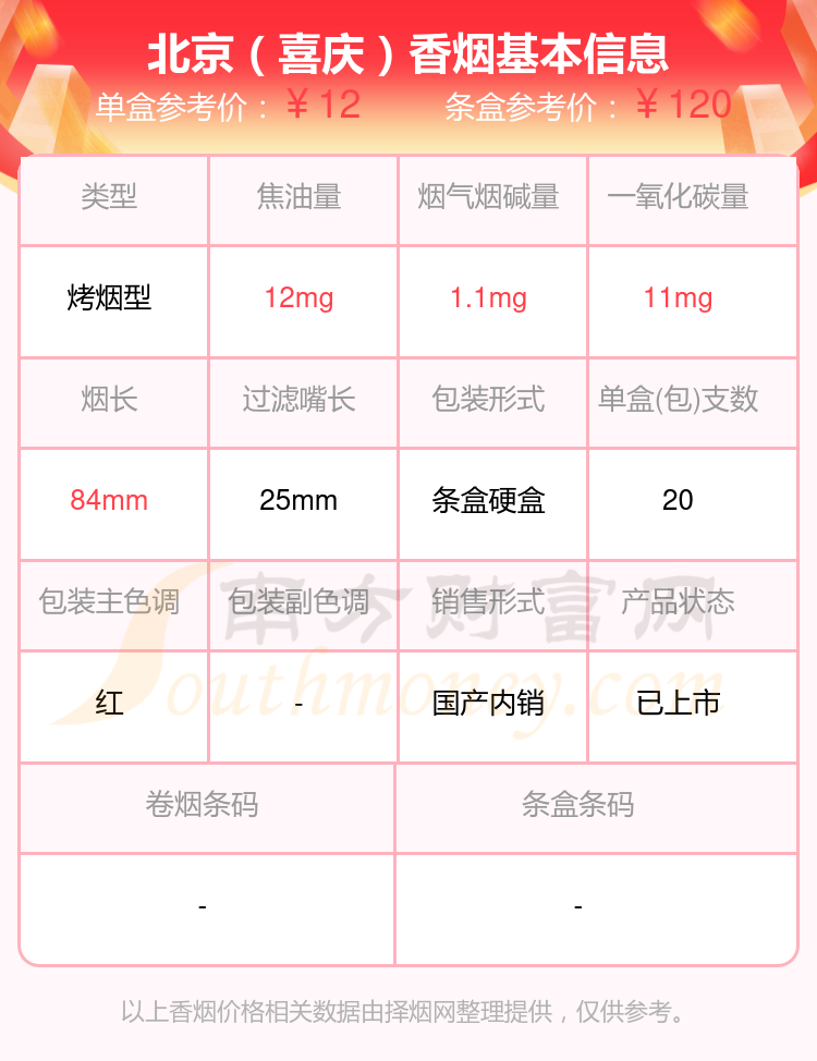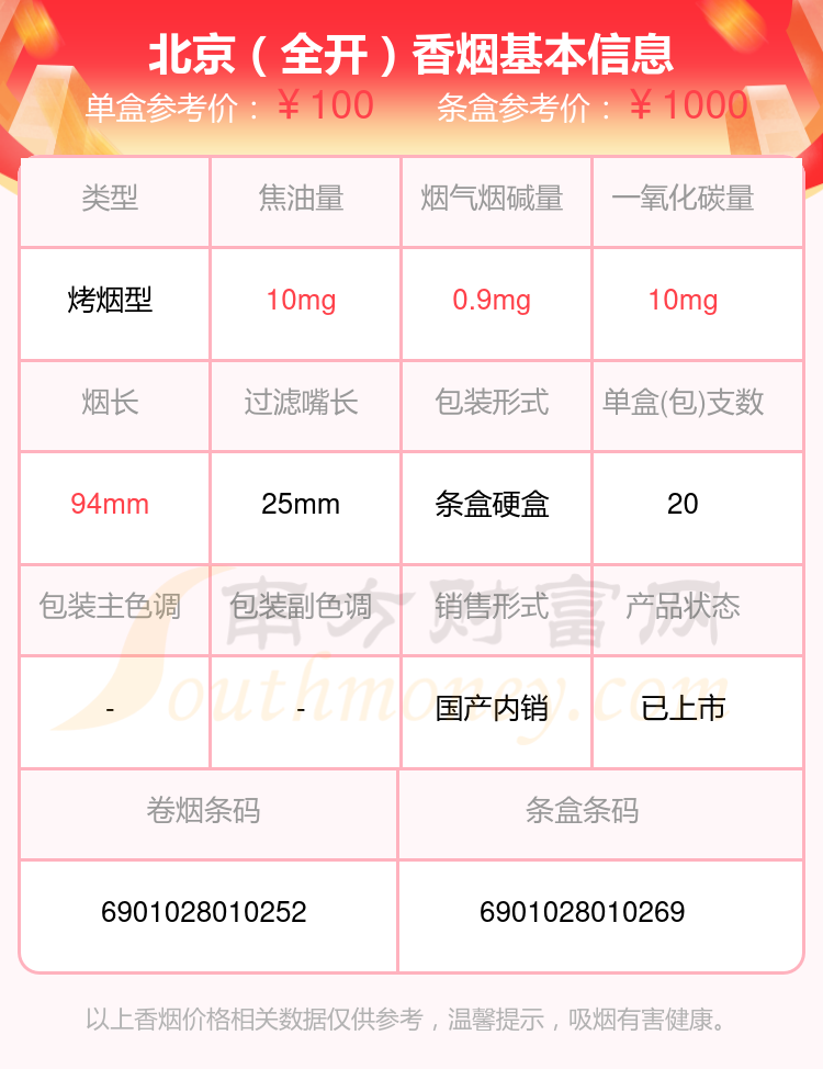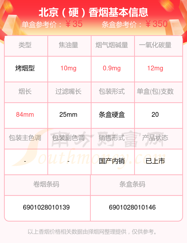 北京(金)参考价12元/包、北京(红)参考价50元/包、北京(喜庆)参考价12元/包、北京(软)参考价50.0元/包、北京(福寿康宁)参考价35元/包、北京(全开)参考价100元/包、北京(软红)参考价50元/包、北京(硬)参考价35元/包等。