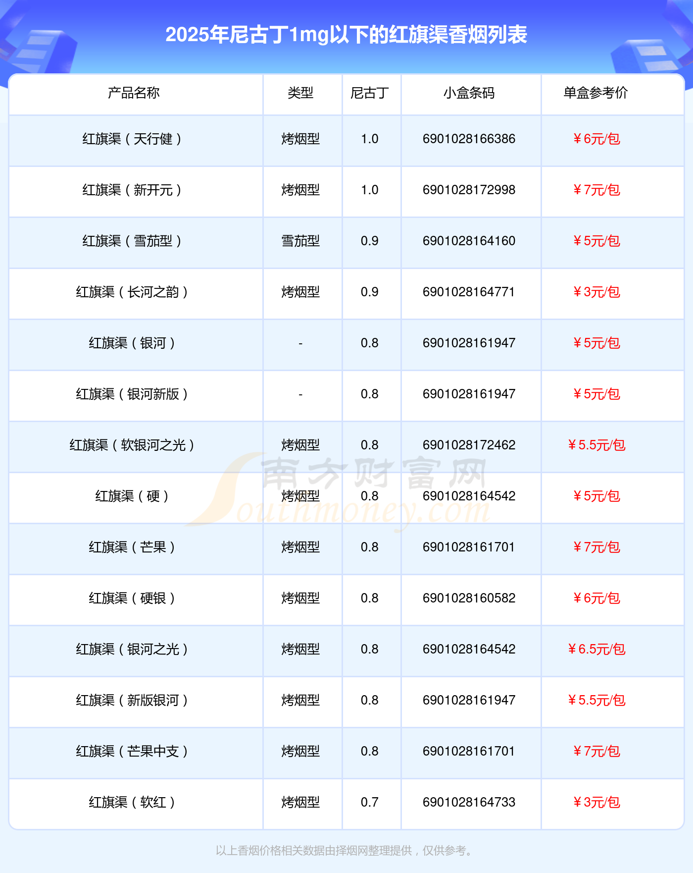 尼古丁1mg以下的红旗渠香烟有哪些?择烟网为大家整理盘点,分别有:红旗渠(天行健)、红旗渠(新开元)、红旗渠(雪茄型)、红旗渠(长河之韵)、红旗渠(银河)、红旗渠(银河新版)、红旗渠(软银河之光)、红旗渠(硬)、红旗渠(芒果)、红旗渠(硬银)等,具体价格如下: