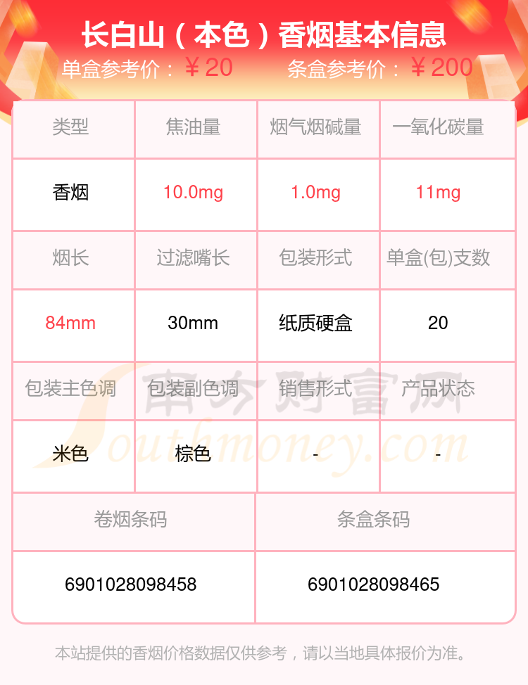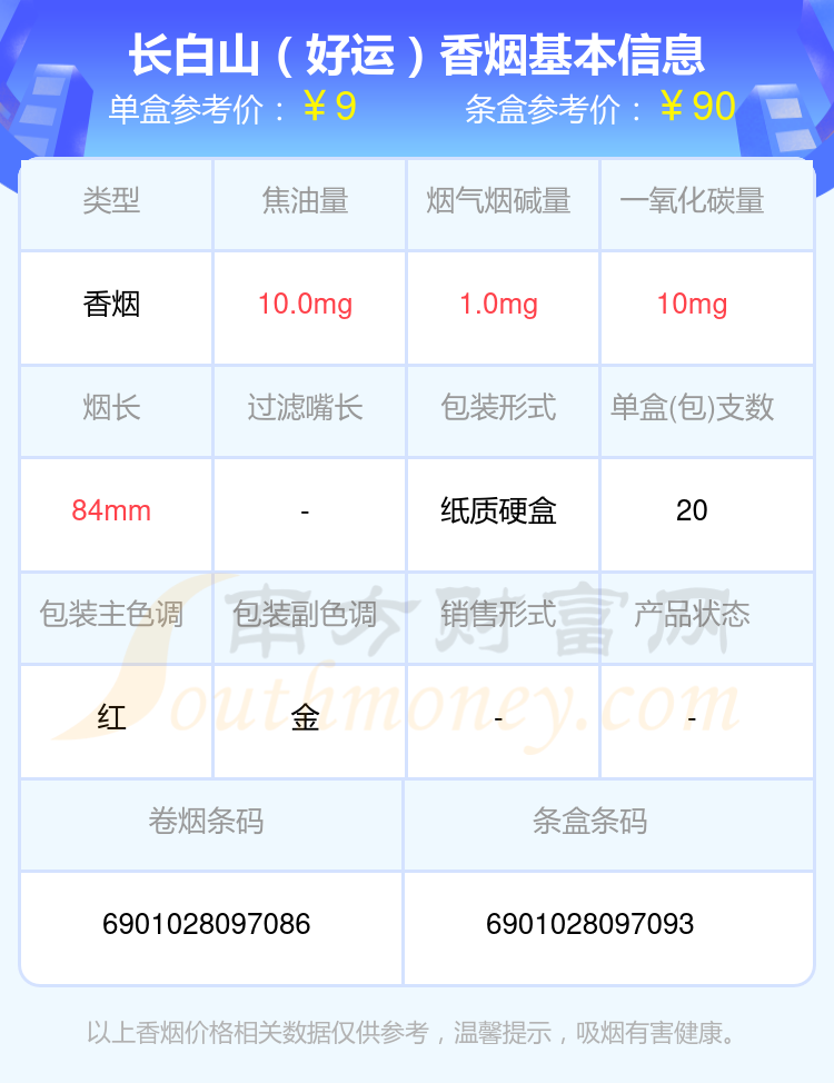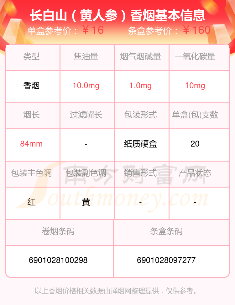 长白山香烟尼古丁2mg以下的烟分别有长白山(好运)参考价9.0元/包、长白山(红人参)参考价11.0元/包、长白山(黄人参)参考价16.0元/包、长白山(金人参)参考价15.0元/包、长白山(本色)参考价20.0元/包、长白山(心归)参考价15.0元/包、长白山(记忆1999)参考价13.0元/包、长白山(人参盛世)参考价40元/包、长白山(人参盛世)参考价40元/包、长白山(小香魁)参考价22.0元/包等。