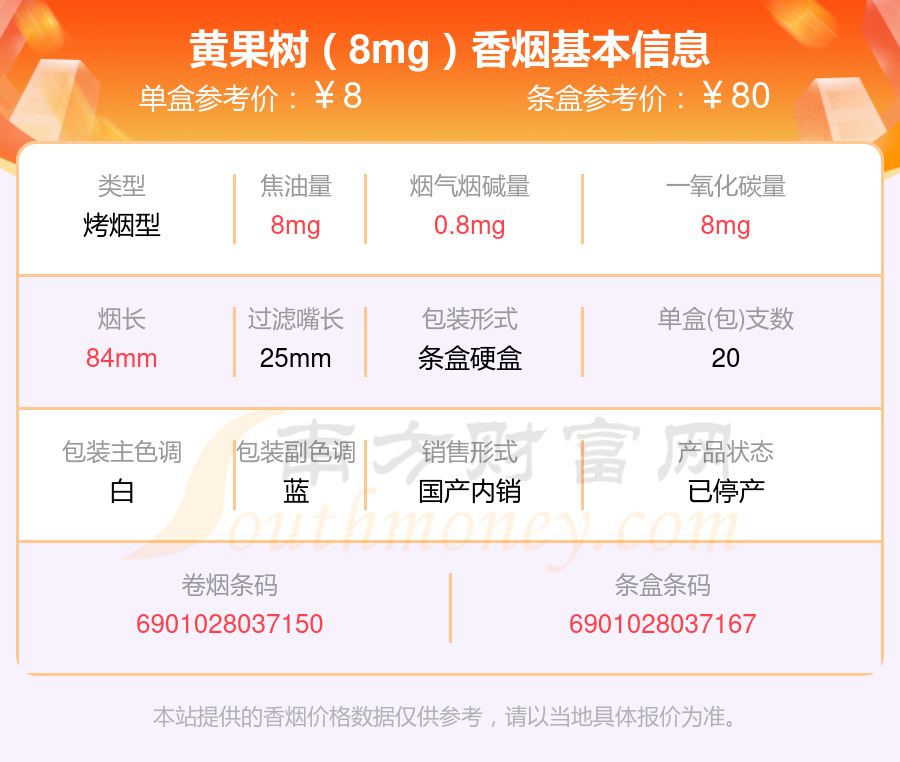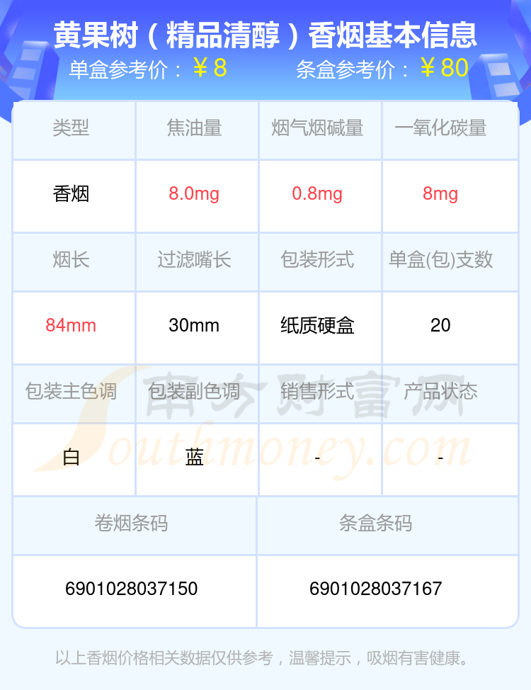 黄果树(精品清醇)参考价8.0元/包、黄果树(8mg)参考价8元/包等。