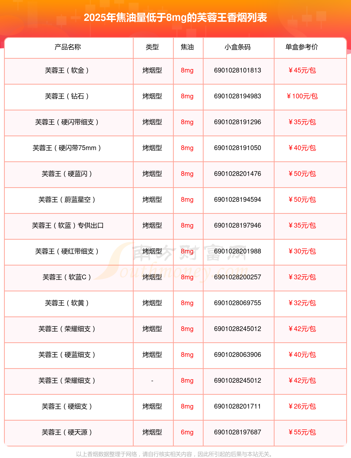 以上香烟数据整理于网络,请自行核实相关内容,因此所引起的后果与本站无关。