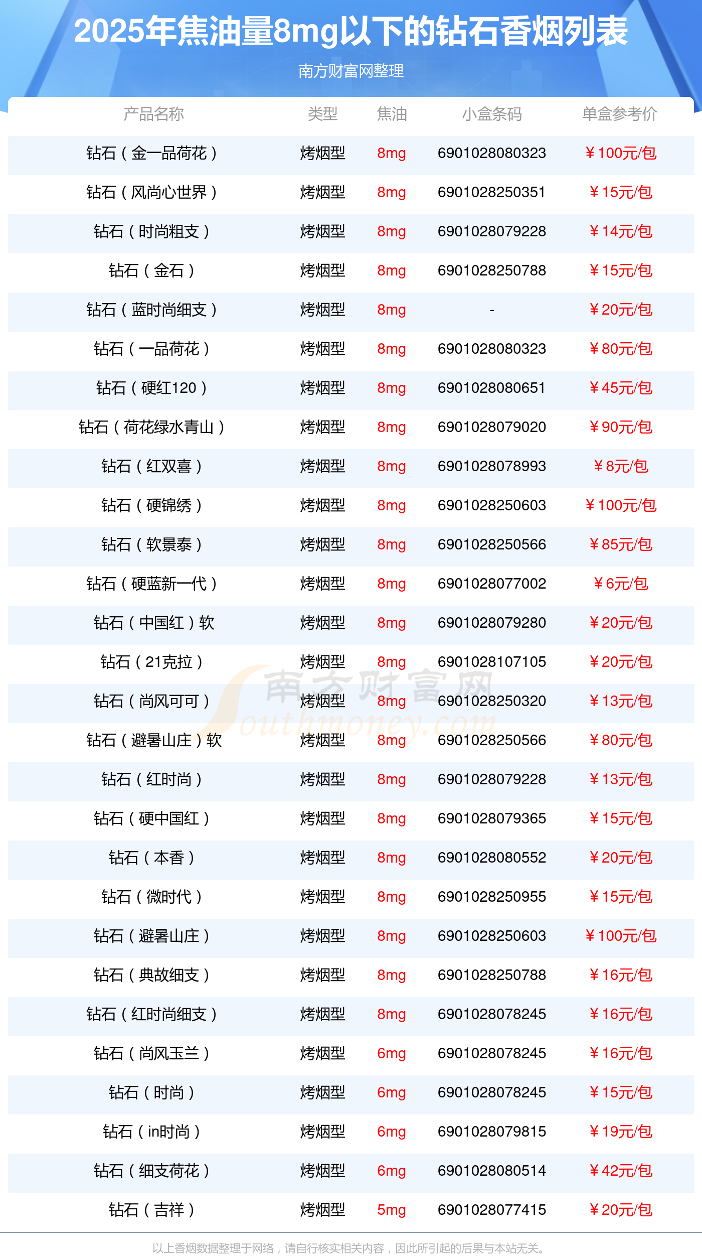 钻石香烟焦油量8mg以下的烟有钻石(金一品荷花)、钻石(风尚心世界)、钻石(时尚粗支)、钻石(金石)、钻石(蓝时尚细支)、钻石(一品荷花)、钻石(硬红120)、钻石(荷花绿水青山)、钻石(红双喜)、钻石(硬锦绣)等,具体价格如下: