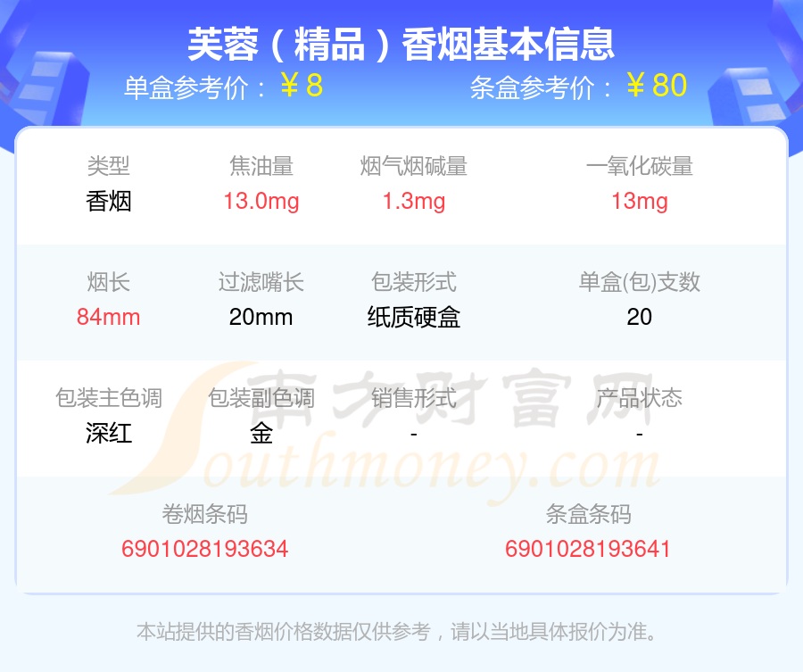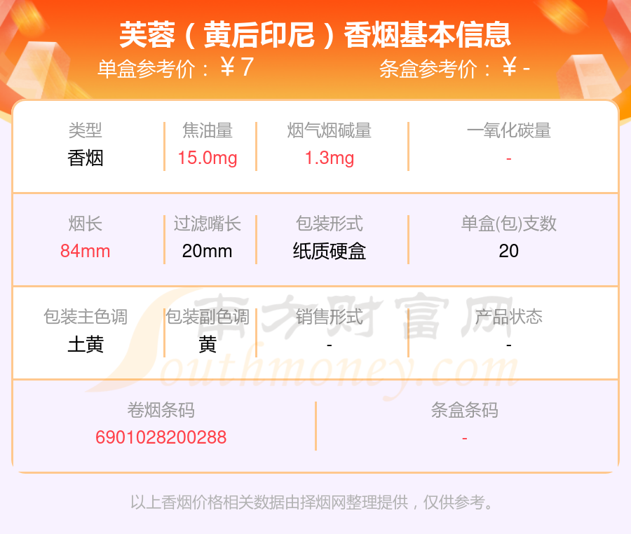 芙蓉(黄后)参考价4.5元/包、芙蓉(黄后印尼)参考价7.0元/包、芙蓉(精品)参考价8.0元/包、芙蓉(佳品)参考价3.0元/包、芙蓉(软红)参考价2.0元/包、芙蓉(软橙)参考价1.5元/包、芙蓉(黄)参考价3.0元/包等。