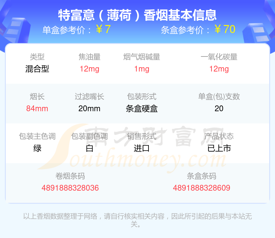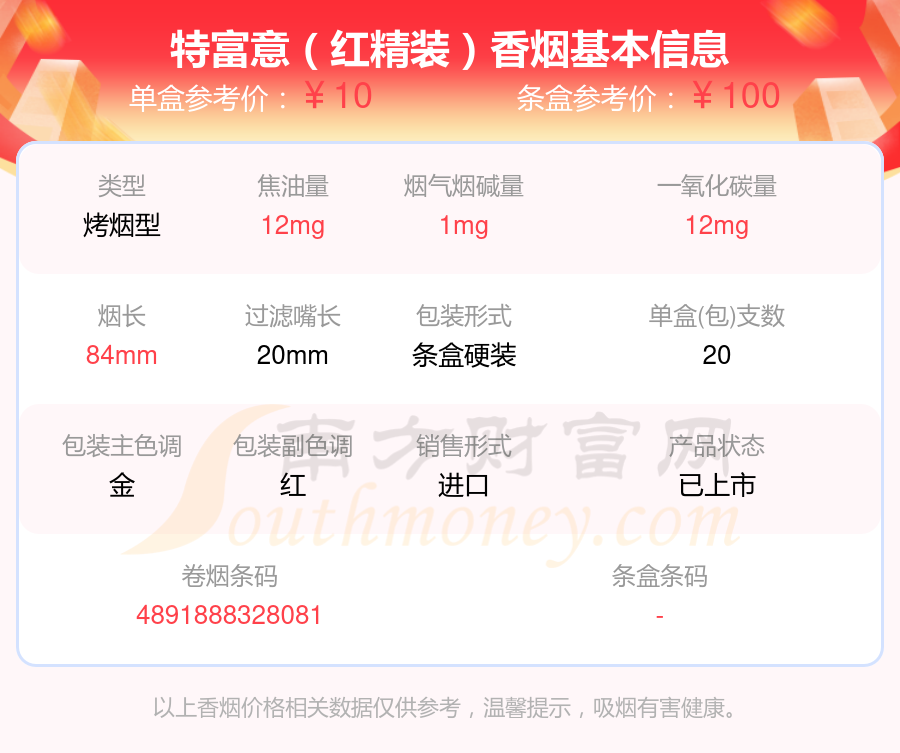 择烟网为大家盘点了焦油量8-15mg左右的特富意香烟,有特富意(红精装)、特富意(薄荷)等,详细价格如下: