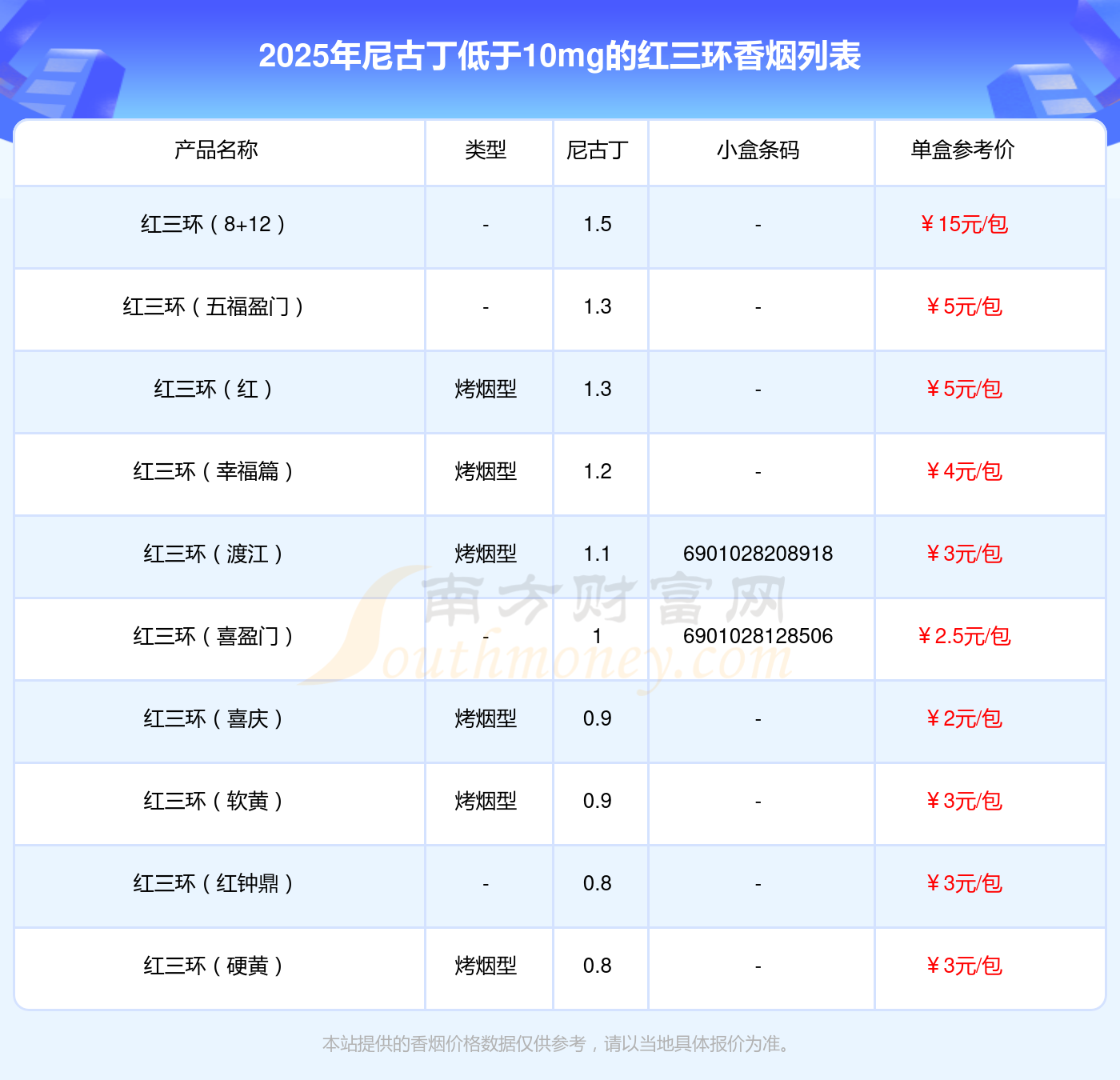 尼古丁低于10mg的红三环香烟有哪些?择烟网为大家整理盘点,分别有: