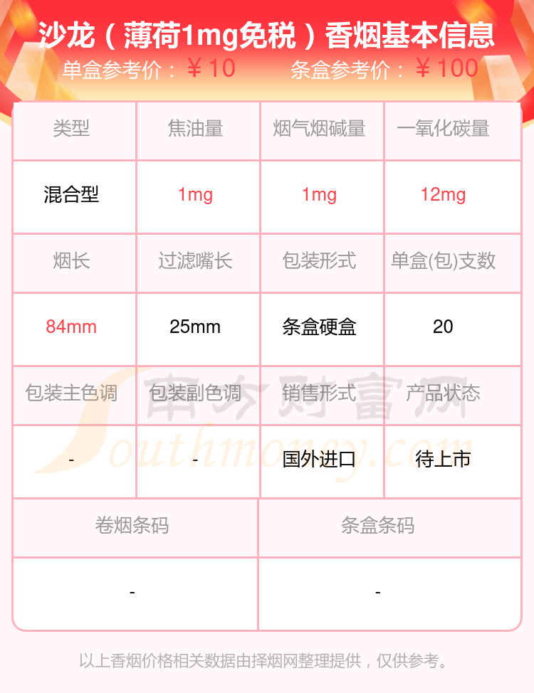 烟碱1mg到2mg左右的SALEM(沙龙)香烟有哪些?择烟网为大家整理盘点,分别有:沙龙(醇美版)、沙龙(薄荷1mg免税)等,具体价格如下: