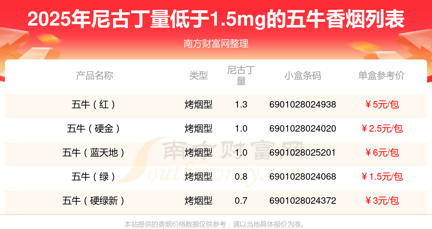 择烟网为大家盘点了尼古丁量低于1.5mg的五牛香烟,分别有五牛(红)、五牛(硬金)、五牛(蓝天地)、五牛(绿)、五牛(硬绿新)等,具体价格如下: