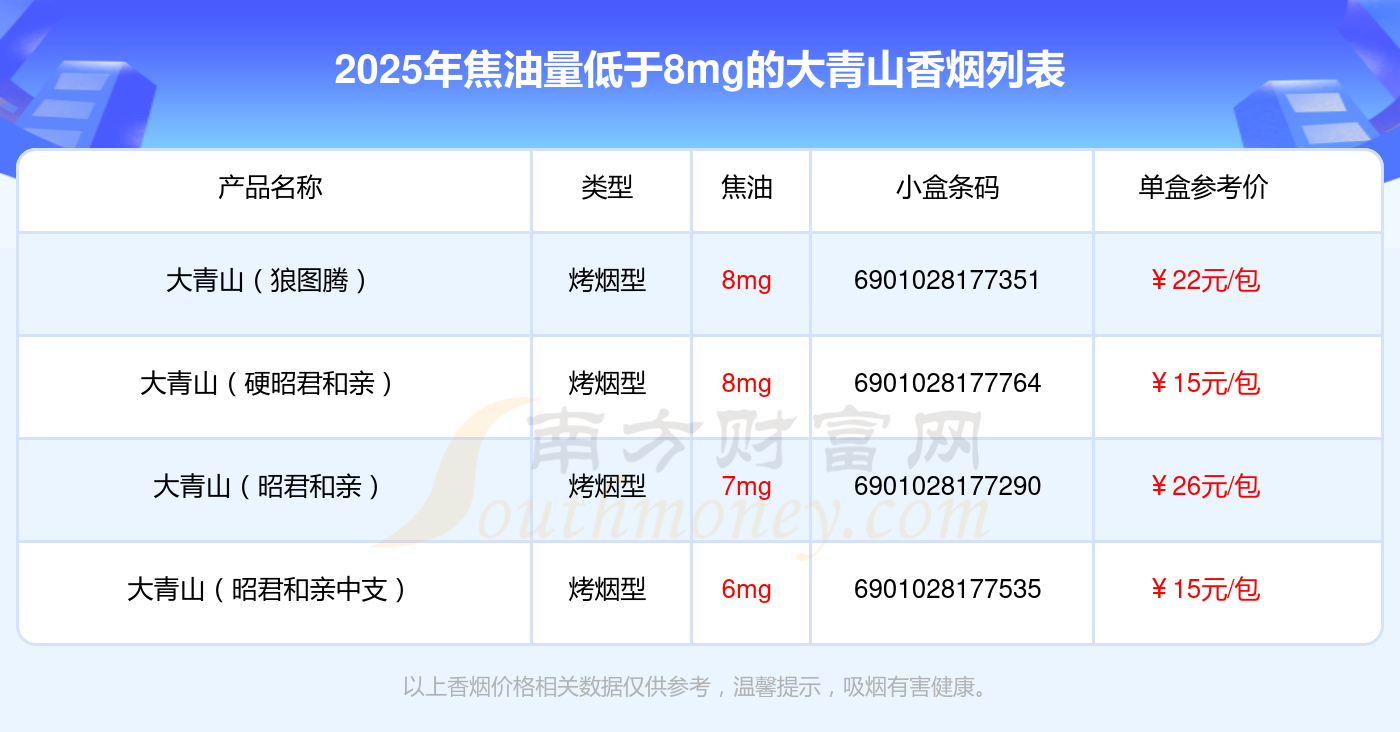 大青山香烟焦油量低于8mg的烟有大青山(狼图腾)、大青山(硬昭君和亲)、大青山(昭君和亲)、大青山(昭君和亲中支)等,具体价格如下:
