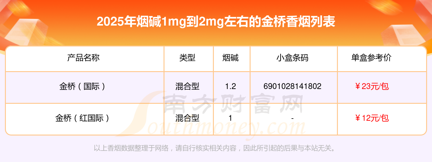 择烟网为大家盘点了金桥香烟烟碱1mg到2mg左右的,分别有金桥(国际)、金桥(红国际)等,详细价格如下: