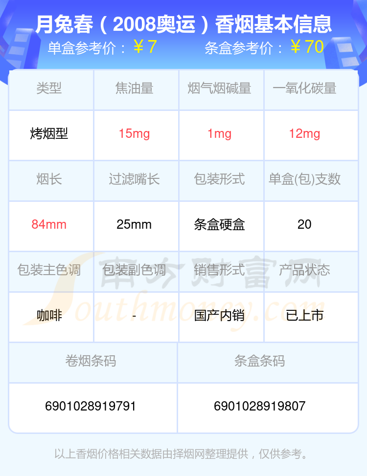 择烟网为大家盘点了月兔香烟焦油量8mg~15mg左右的,分别有月兔(月兔王)、月兔春(2008奥运)、月兔(小月兔)、月兔(特醇)等,具体价格如下: