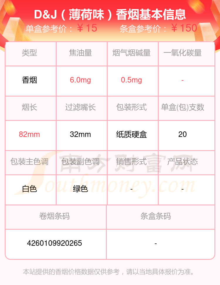 D&J(薄荷味)参考价15.0元/包、D&J(金版)参考价15.0元/包等。