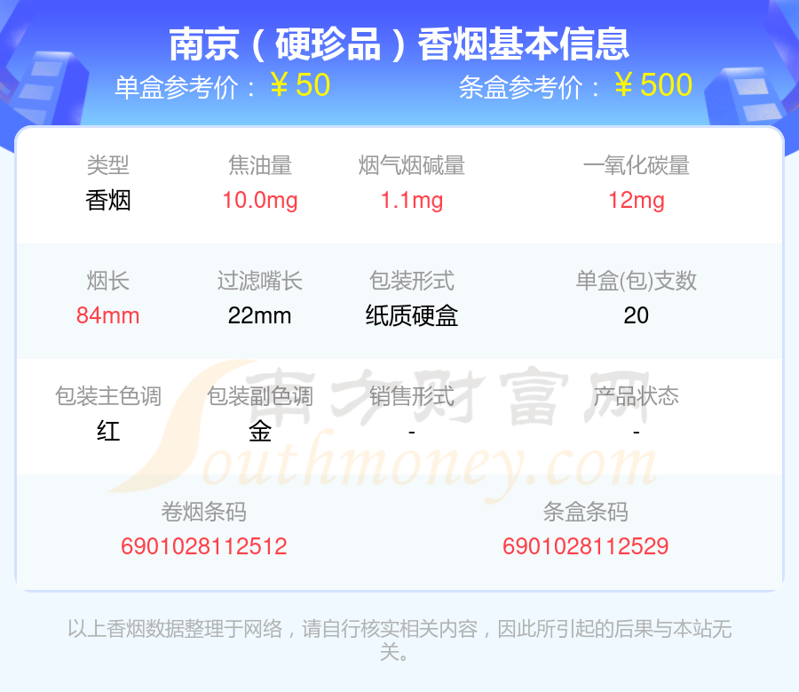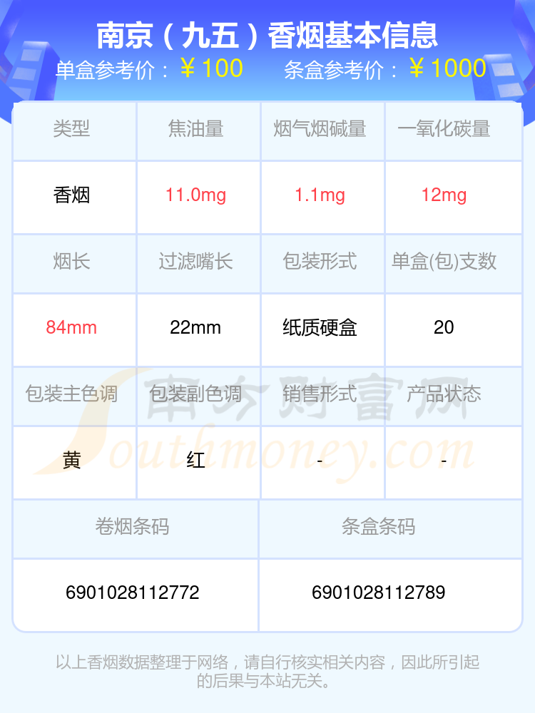 南京香烟烟碱低于1.5mg的烟有南京(七星)、南京(精品)、南京(五星)、南京(紫树)、南京(听珍品)、南京(珍品)、南京(出口喜庆)、南京(硬珍品)、南京(九五)、南京(佳品)等,详细价格如下: