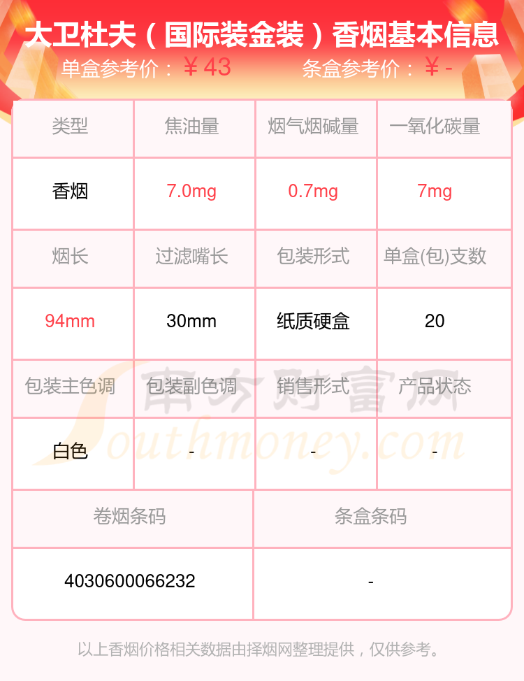 Davidoff(大卫杜夫)香烟40元-60元的烟有大卫杜夫(国际装经典)、大卫杜夫(国际装金装)、大卫杜夫(炫红国际版)、大卫杜夫(炫黑)、Davidoff(炫红国际版)等,具体价格如下: