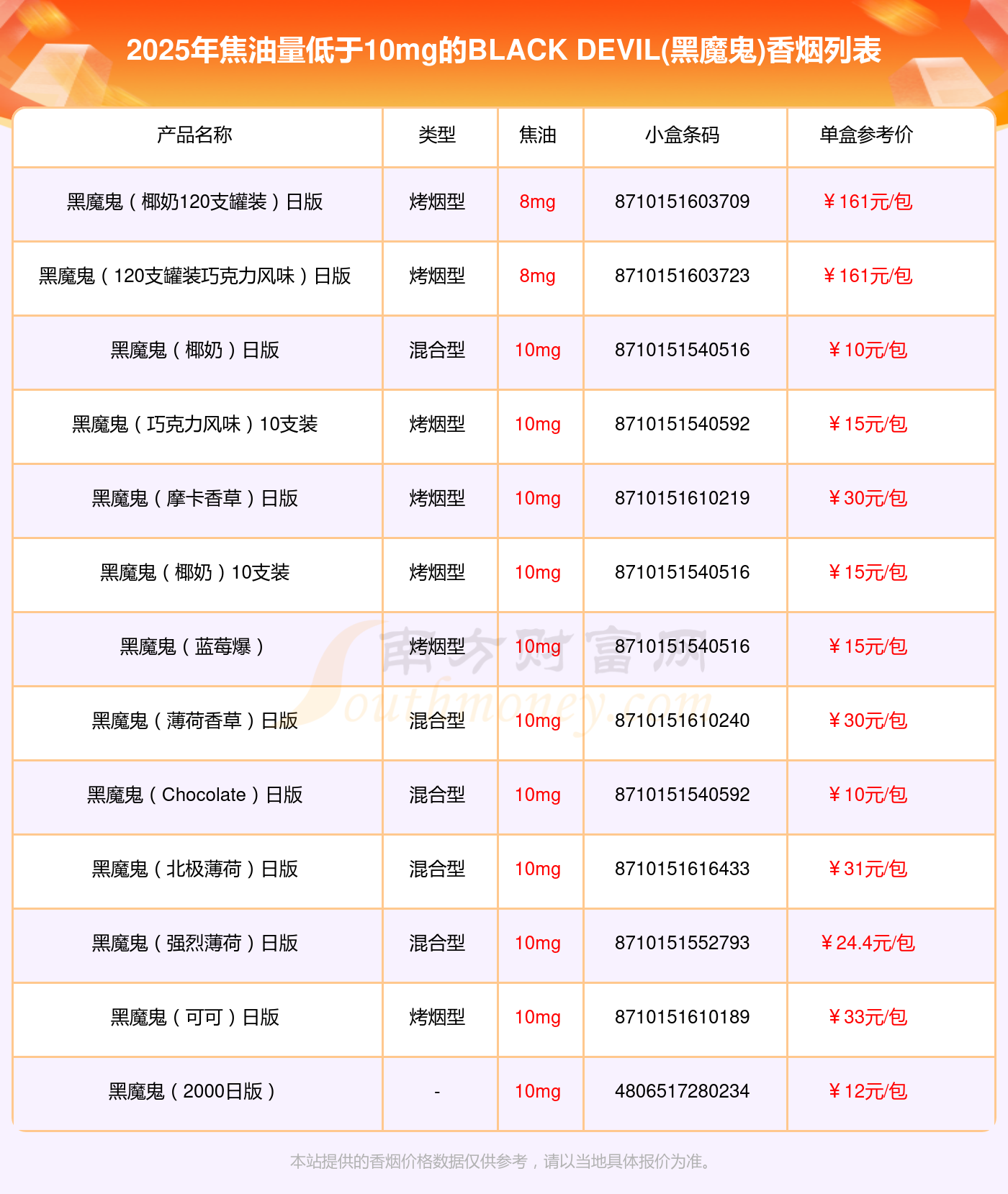 择烟网为大家盘点了焦油量低于10mg的BLACK DEVIL(黑魔鬼)香烟,有以下这些: