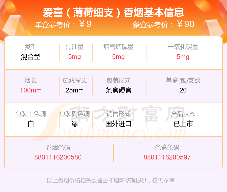 择烟网为大家盘点了ESSE(爱喜)香烟尼古丁高于3mg的,分别有爱喜(薄荷细支)、爱喜(金)等,详细价格如下: