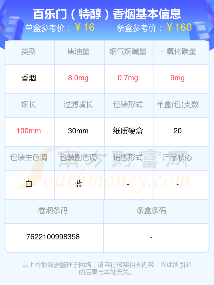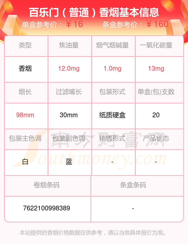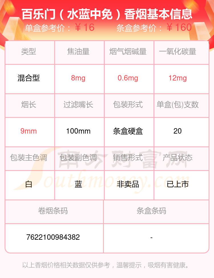 百乐门(普通)参考价16.0元/包、百乐门(蓝)参考价16元/包、俄罗斯百乐门蓝钻参考价18元/包、百乐门(100s)中税版参考价38.0元/包、百乐门(特醇)参考价16.0元/包、百乐门(水蓝)参考价18元/包、百乐门(水蓝中国版)参考价16元/包、中免百乐门水蓝100S参考价18元/包、百乐门(水蓝中免)参考价16元/包、百乐门(特醇100免税韩版)参考价14.0元/包等。