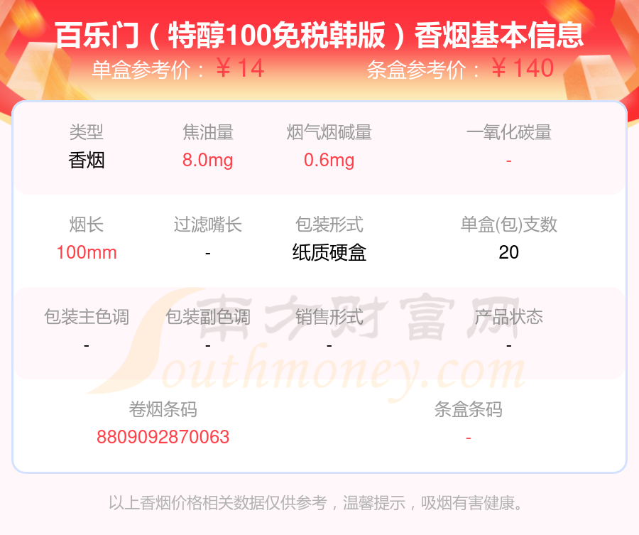以上香烟数据整理于网络,请自行核实相关内容,因此所引起的后果与本站无关。