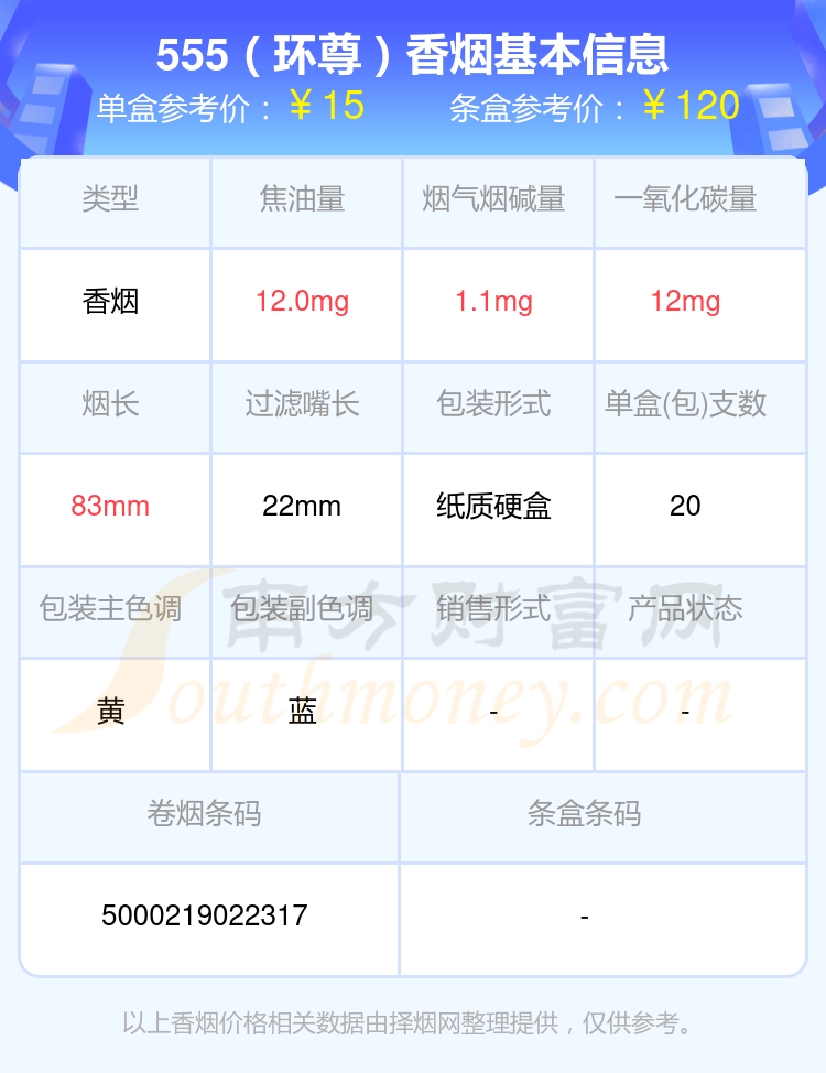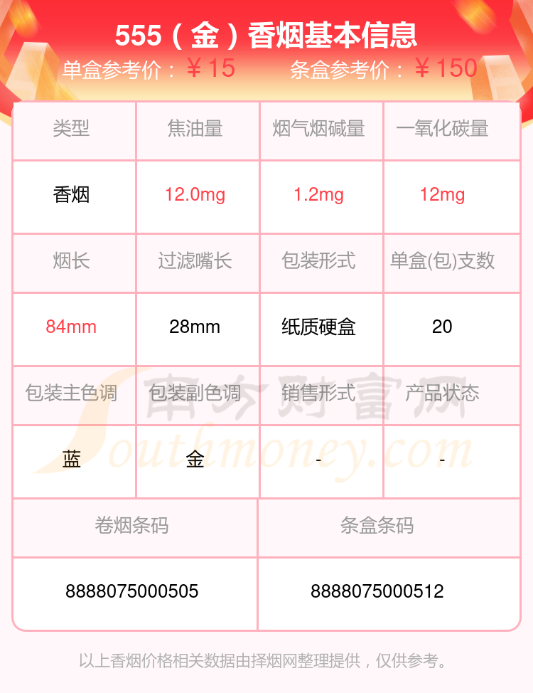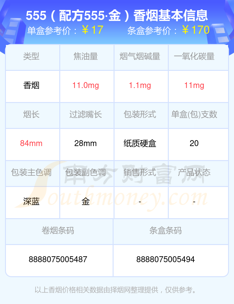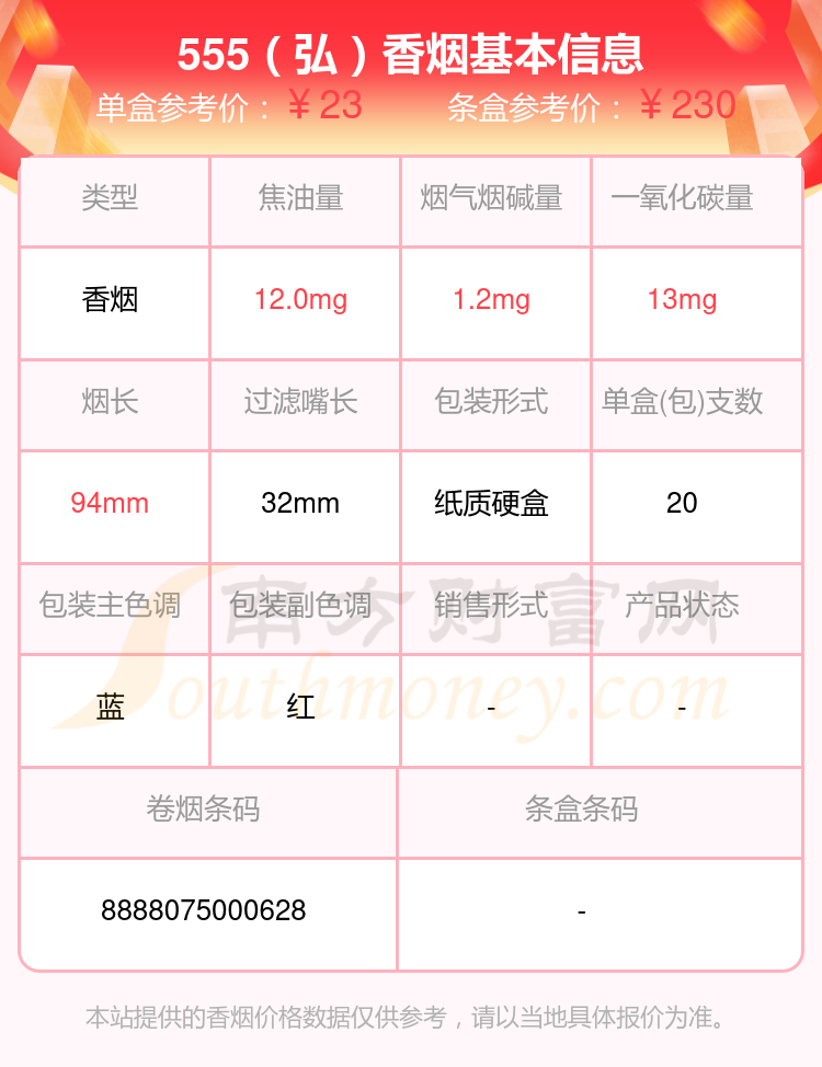 555(蓝金限量版中免)参考价18.0元/包、555(金中免)参考价11.0元/包、555(金)参考价15.0元/包、555(弘中免)参考价13.0元/包、555(金中免新春贺岁版)参考价12.0元/包、555(弘)参考价23.0元/包、555(配方555·金)参考价17.0元/包、555(配方·天元)参考价20.0元/包、555(环尊)参考价15.0元/包、555(国际版)参考价30.0元/包等。