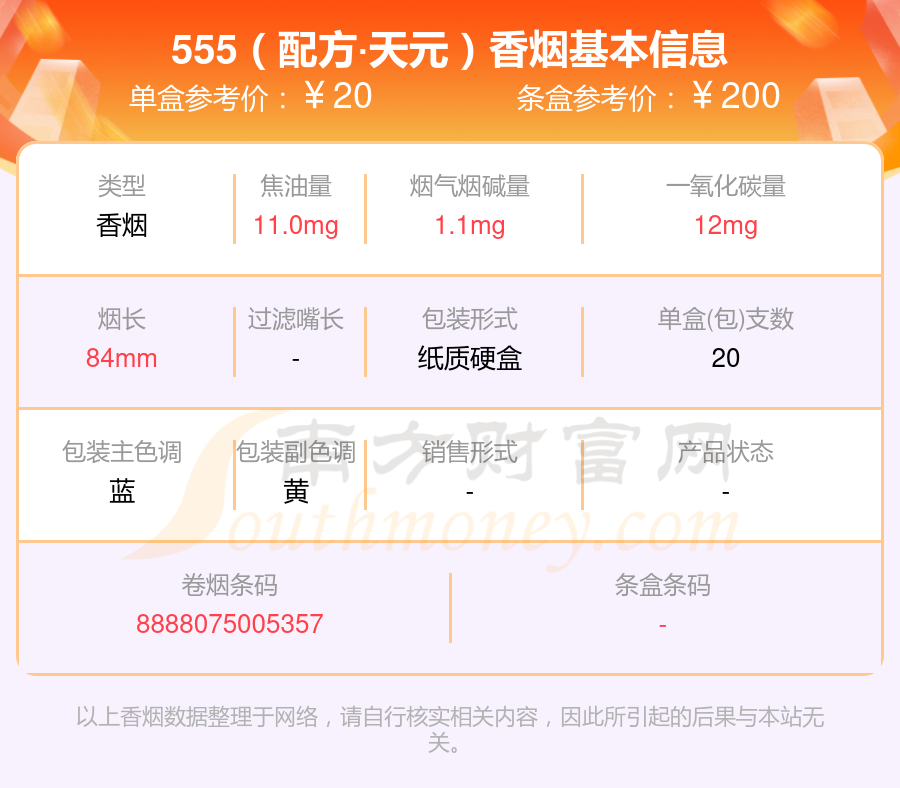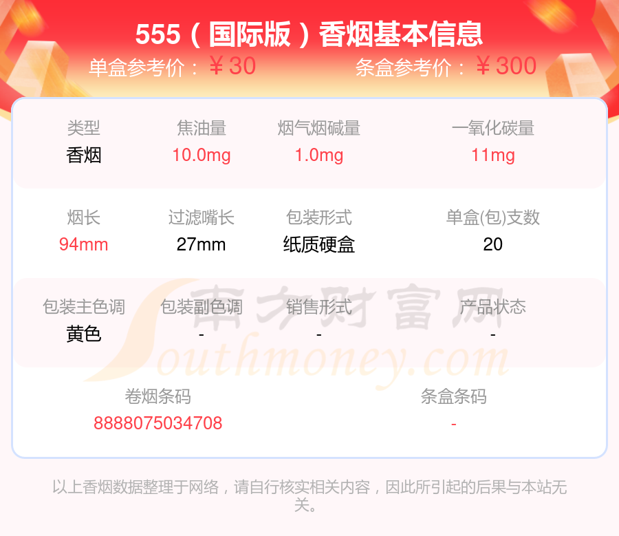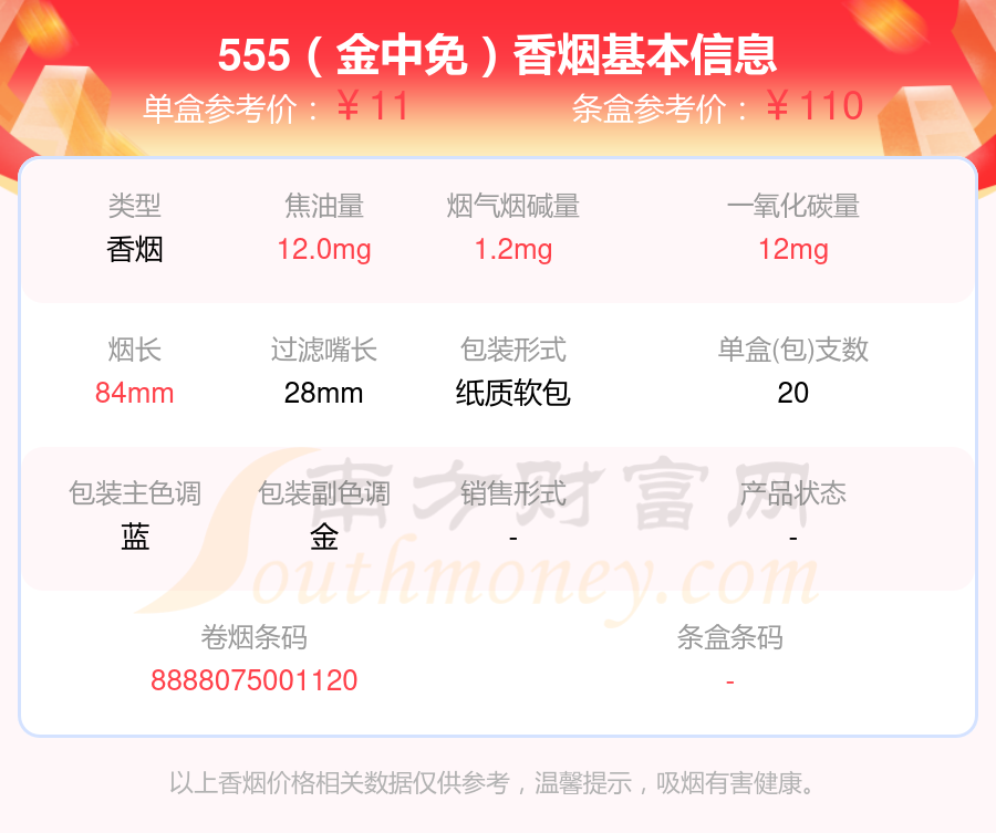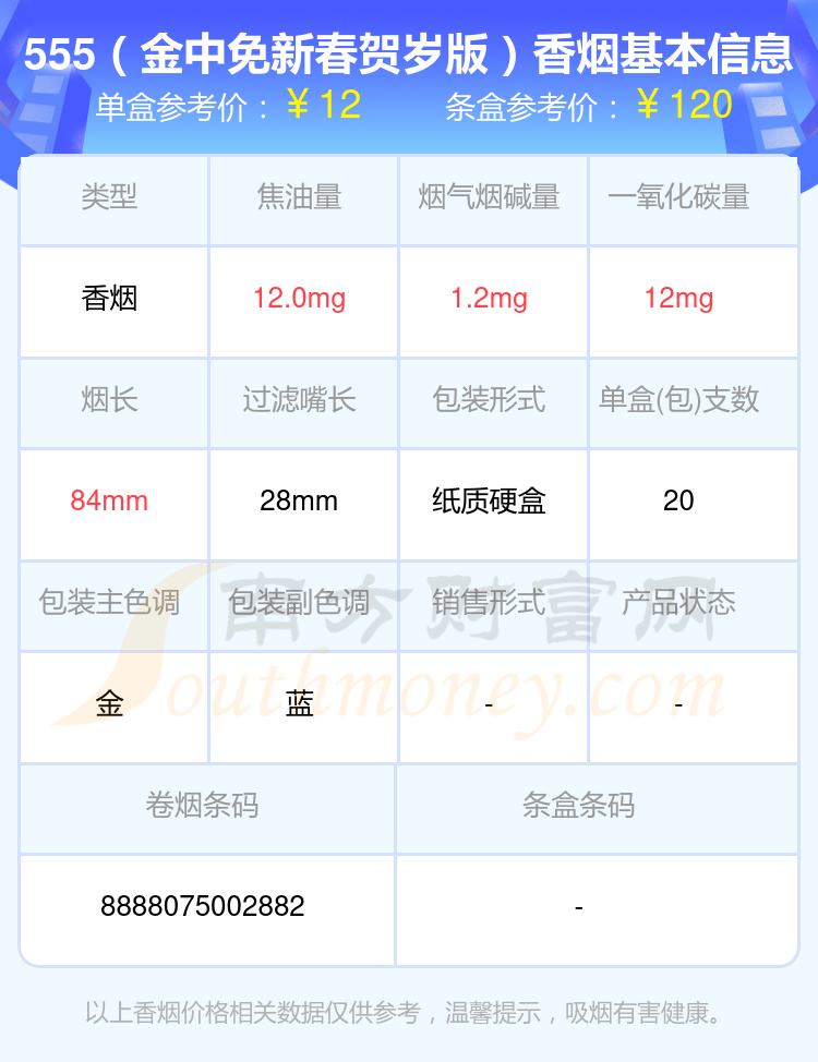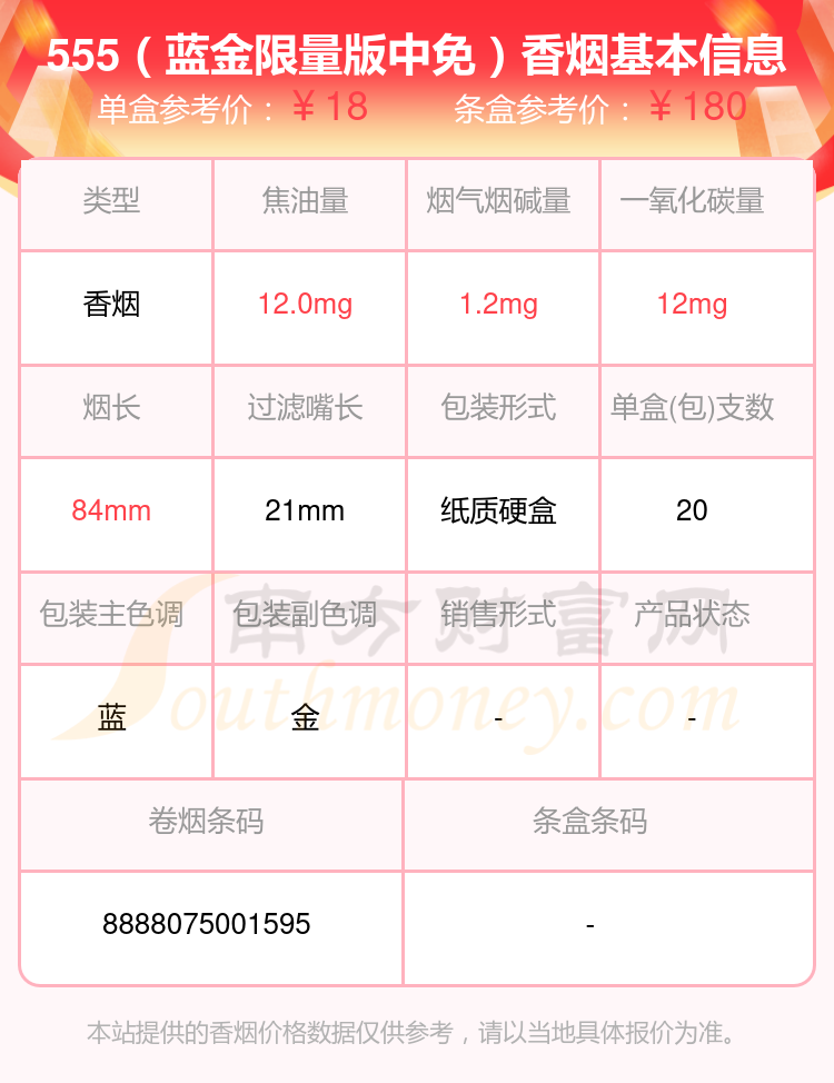 555(蓝金限量版中免)参考价18.0元/包、555(金中免)参考价11.0元/包、555(金)参考价15.0元/包、555(弘中免)参考价13.0元/包、555(金中免新春贺岁版)参考价12.0元/包、555(弘)参考价23.0元/包、555(配方555·金)参考价17.0元/包、555(配方·天元)参考价20.0元/包、555(环尊)参考价15.0元/包、555(国际版)参考价30.0元/包等。