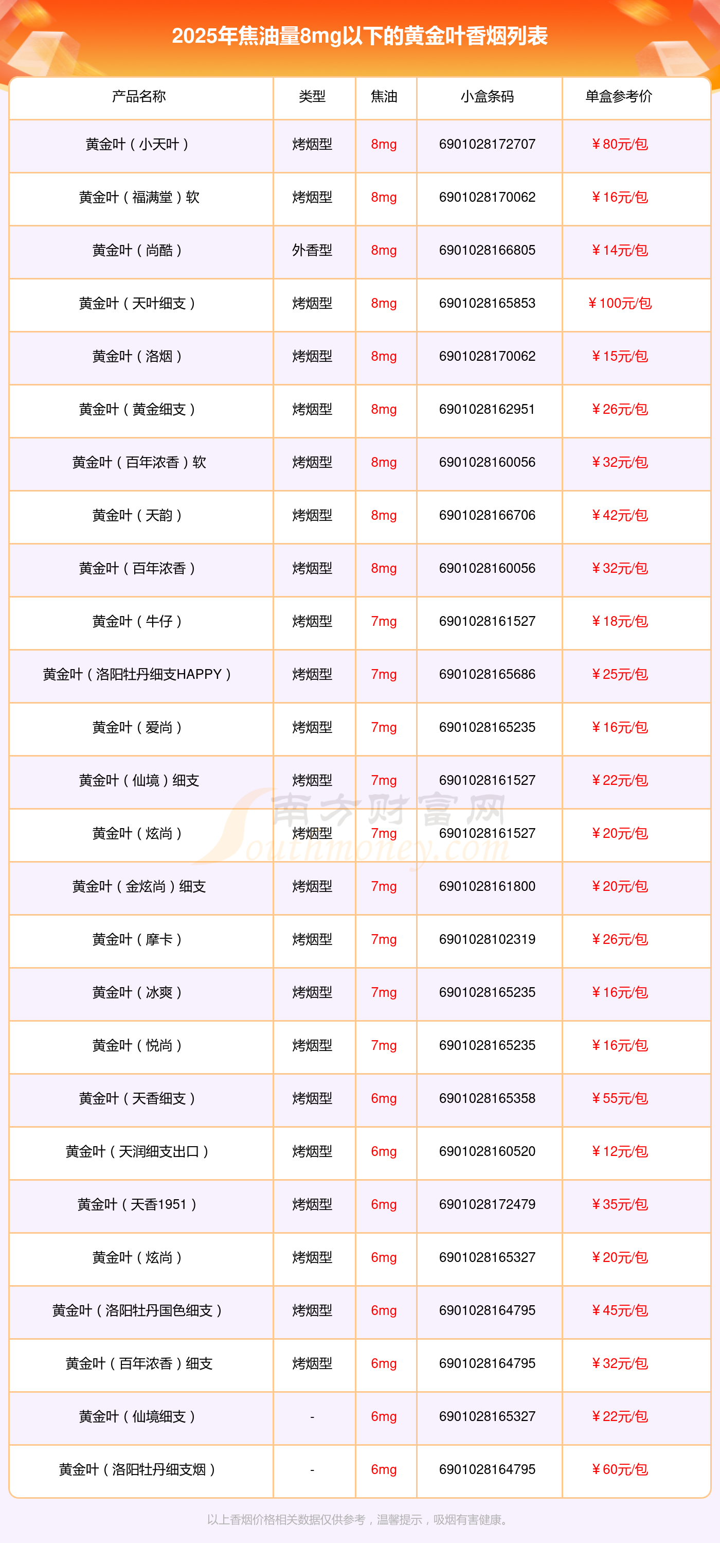 择烟网为大家盘点了焦油量8mg以下的黄金叶香烟,有黄金叶(小天叶)、黄金叶(福满堂)软、黄金叶(尚酷)、黄金叶(天叶细支)、黄金叶(洛烟)、黄金叶(黄金细支)、黄金叶(百年浓香)软、黄金叶(天韵)、黄金叶(百年浓香)、黄金叶(牛仔)等,详细价格如下: