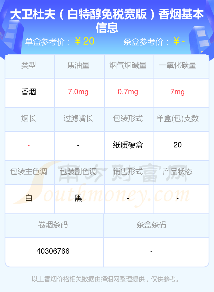 择烟网为大家盘点了焦油量8mg以下的Davidoff(大卫杜夫)香烟,分别有大卫杜夫(纤秀)、大卫杜夫(金)中版、大卫杜夫(金装)、大卫杜夫(白特醇香港免税)、大卫杜夫(国际装金装)、大卫杜夫(白特醇中免)、大卫杜夫(白特醇免税宽版)、大卫杜夫(金)欧盟免税版、大卫杜夫(炫银)、大卫杜夫(金装港版)等,具体价格如下: