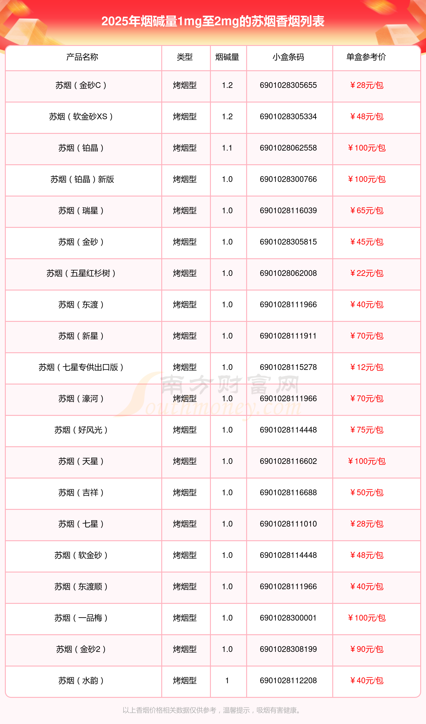 苏烟香烟烟碱量1mg至2mg的烟有苏烟(金砂C)、苏烟(软金砂XS)、苏烟(铂晶)、苏烟(铂晶)新版、苏烟(瑞星)、苏烟(金砂)、苏烟(五星红杉树)、苏烟(东渡)、苏烟(新星)、苏烟(七星专供出口版)等,详细价格如下: