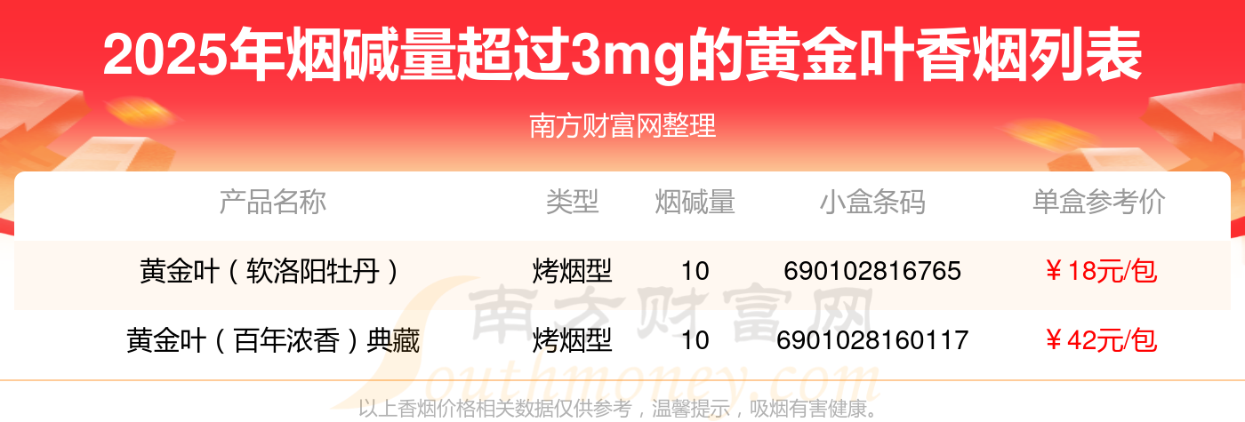 黄金叶香烟烟碱量超过3mg的烟有黄金叶(软洛阳牡丹)、黄金叶(百年浓香)典藏等,具体价格如下: