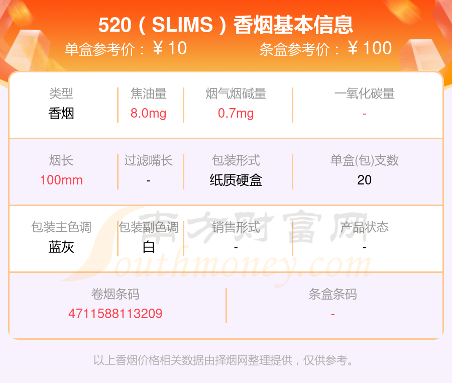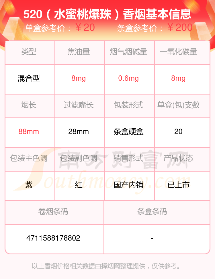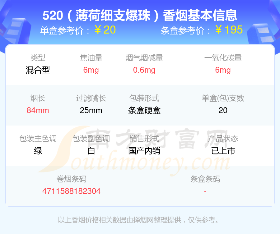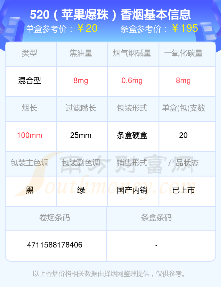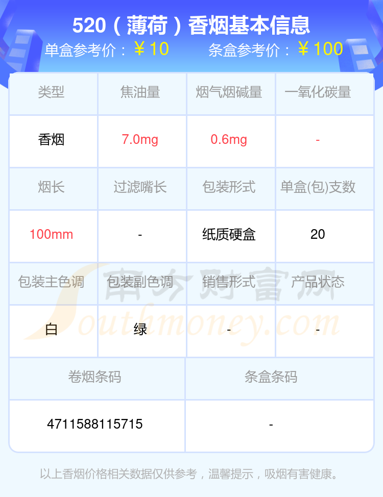 择烟网为大家盘点了520香烟尼古丁量低于10mg的,分别有520(哈密瓜爆珠)、520(SLIMS)、520(薄荷)、520(薄荷细支爆珠)、520(蓝莓爆珠)、520(苹果爆珠)、520(哈密瓜细支爆珠)、520(蓝玫瑰101)、520(水蜜桃爆珠)、520(玫瑰)等,详细价格如下: