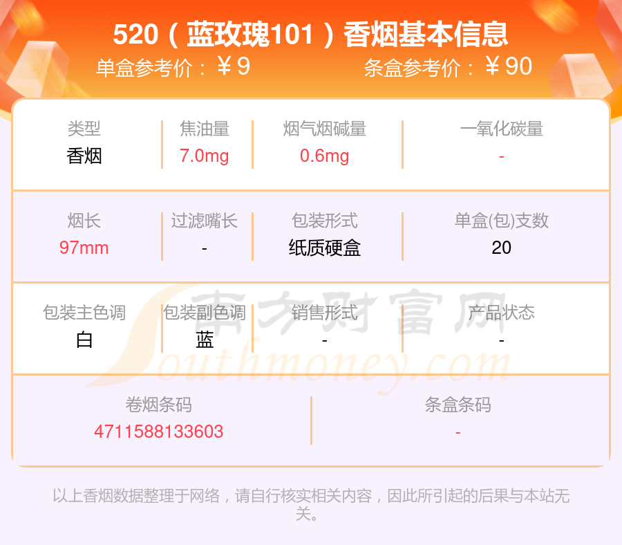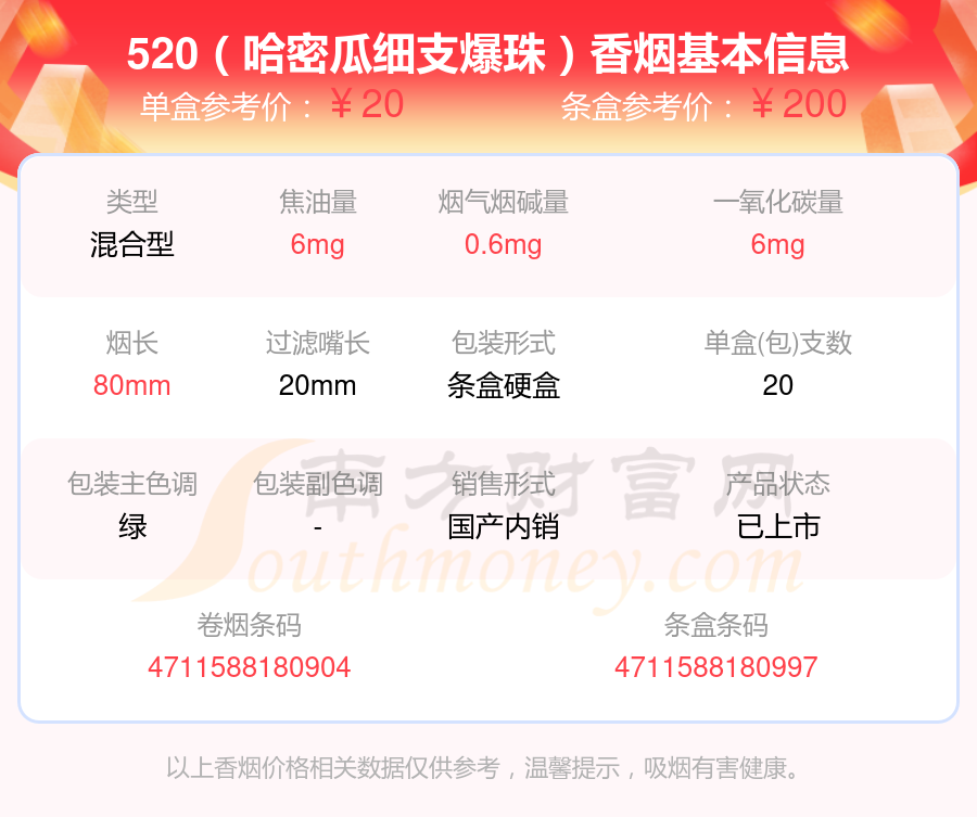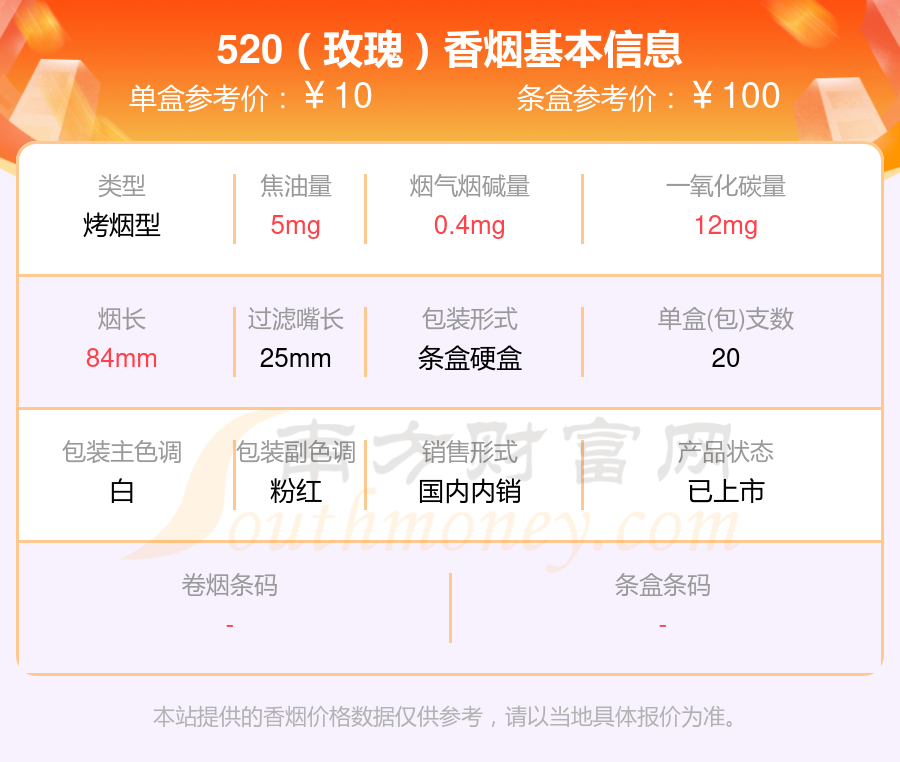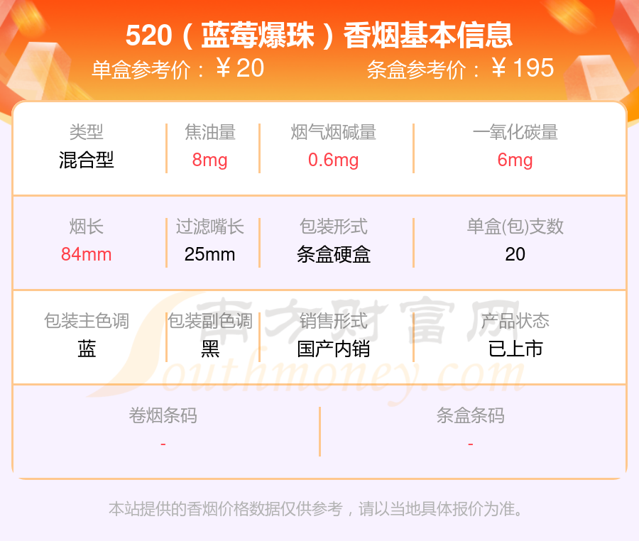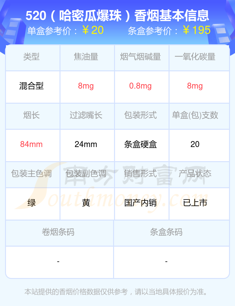 择烟网为大家盘点了520香烟尼古丁量低于10mg的,分别有520(哈密瓜爆珠)、520(SLIMS)、520(薄荷)、520(薄荷细支爆珠)、520(蓝莓爆珠)、520(苹果爆珠)、520(哈密瓜细支爆珠)、520(蓝玫瑰101)、520(水蜜桃爆珠)、520(玫瑰)等,详细价格如下: