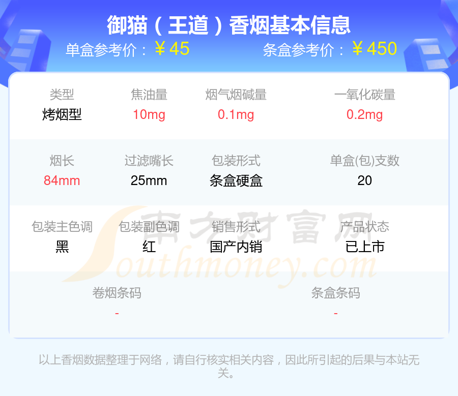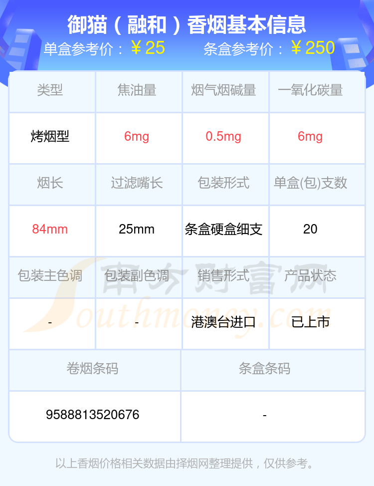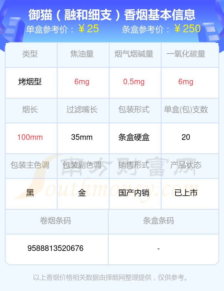 烟碱低于0.5mg的御猫香烟有哪些?择烟网为大家整理盘点,分别有:御猫(融和细支)、御猫(融和)、御猫(王道)等,具体价格如下: