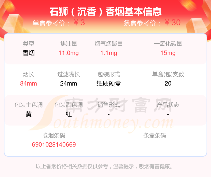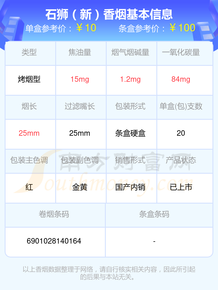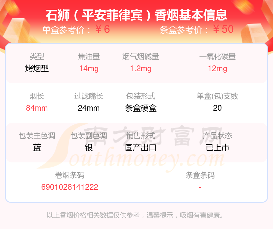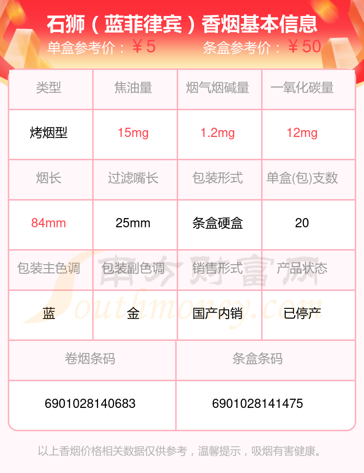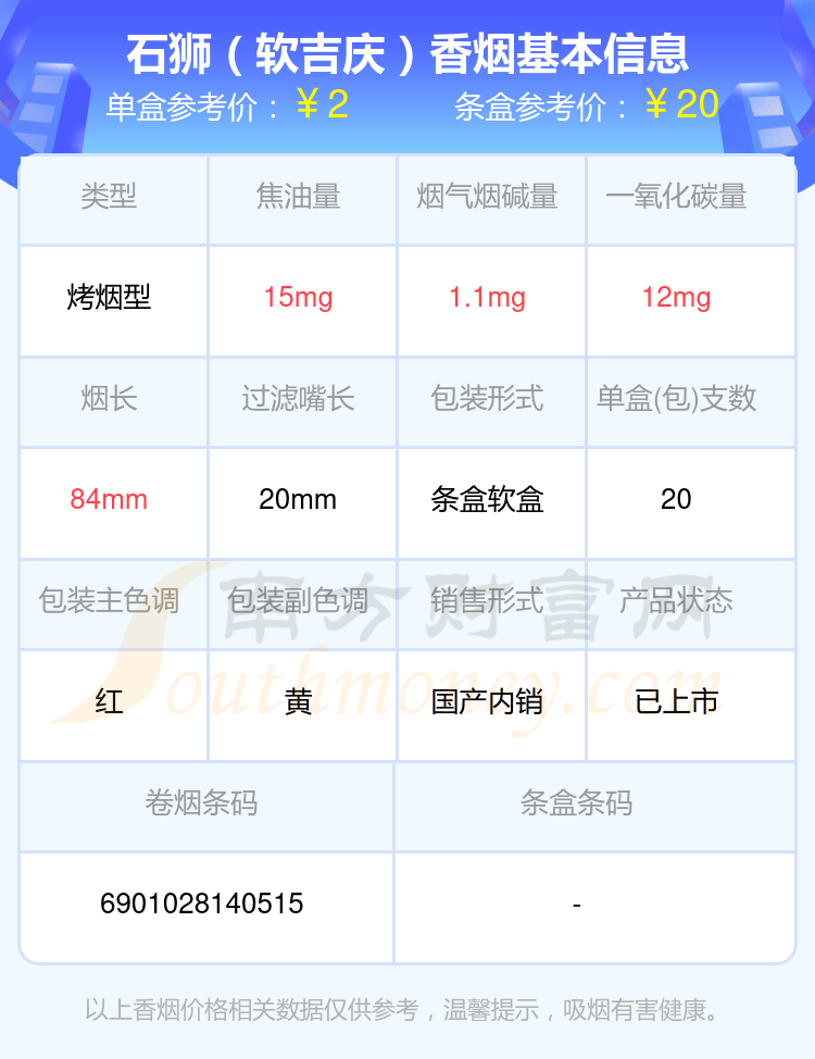 石狮(软吉祥)参考价15元/包、石狮(红菲律宾)参考价10元/包、石狮(新)参考价10元/包、石狮(蓝菲律宾)参考价5元/包、石狮(平安菲律宾)参考价6元/包、石狮(喜狮)参考价10元/包、石狮(软富健)参考价6.0元/包、石狮(沉香)参考价3.0元/包、石狮(软吉庆)参考价2元/包、石狮(平安)参考价5元/包等。