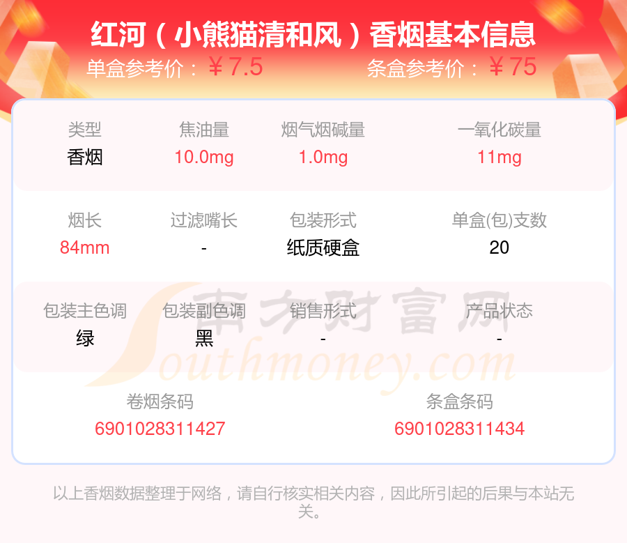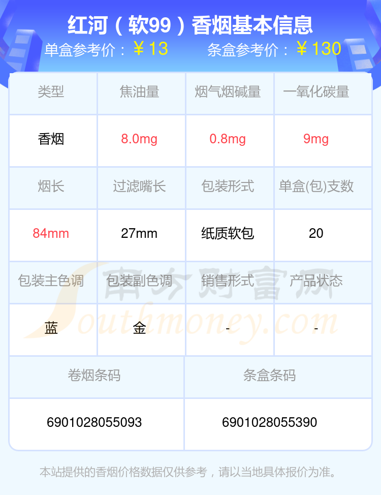 焦油量10mg以下的红河香烟有哪些?择烟网为大家整理盘点,有红河(软99)、红河(硬99)、红河(小熊猫清和风)、红河(硬V8)、红河(硬66)、红河(小熊猫世纪风)、红河(道)、红河(快乐)、红河(A7)、红河(去野)等,详细价格如下: