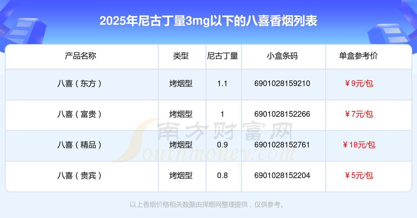 择烟网为大家盘点了尼古丁量3mg以下的八喜香烟,有八喜(东方)、八喜(富贵)、八喜(精品)、八喜(贵宾)等,详细价格如下: