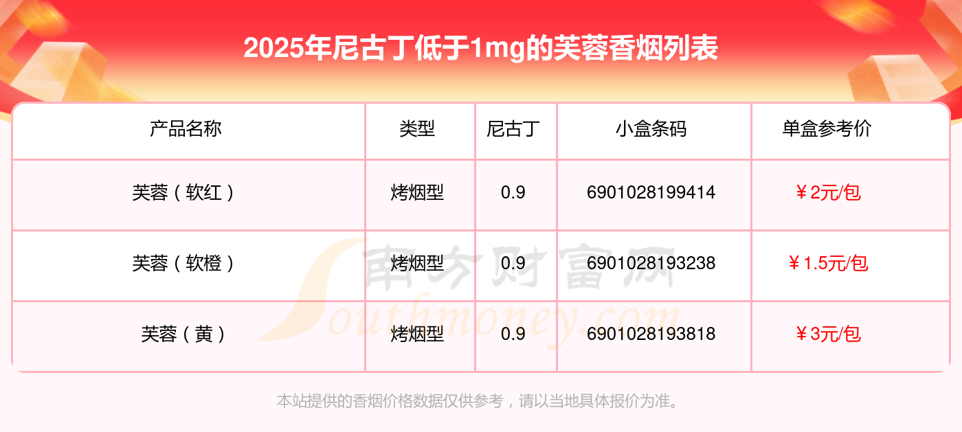 择烟网为大家盘点了尼古丁低于1mg的芙蓉香烟,有芙蓉(软红)、芙蓉(软橙)、芙蓉(黄)等,详细价格如下: