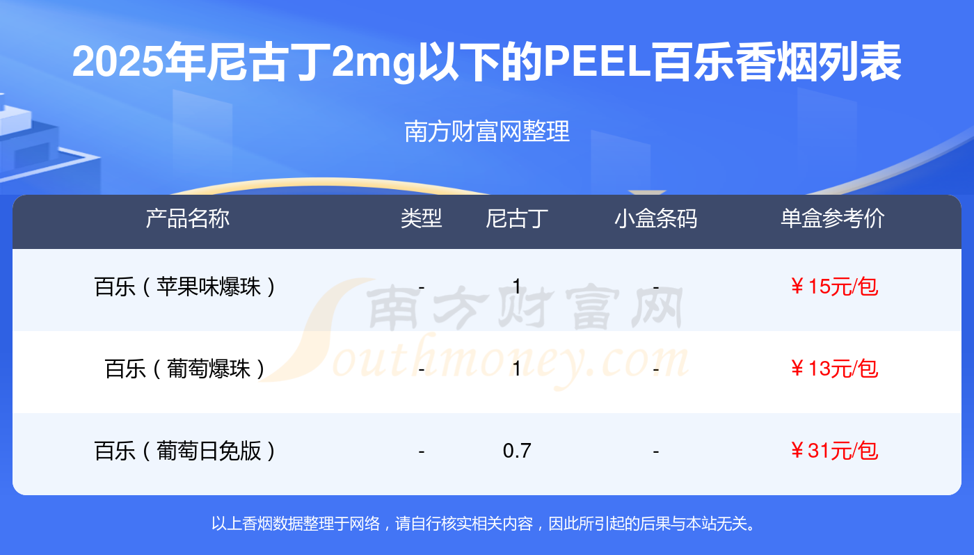 择烟网为大家盘点了PEEL百乐香烟尼古丁2mg以下的烟,有以下这些: